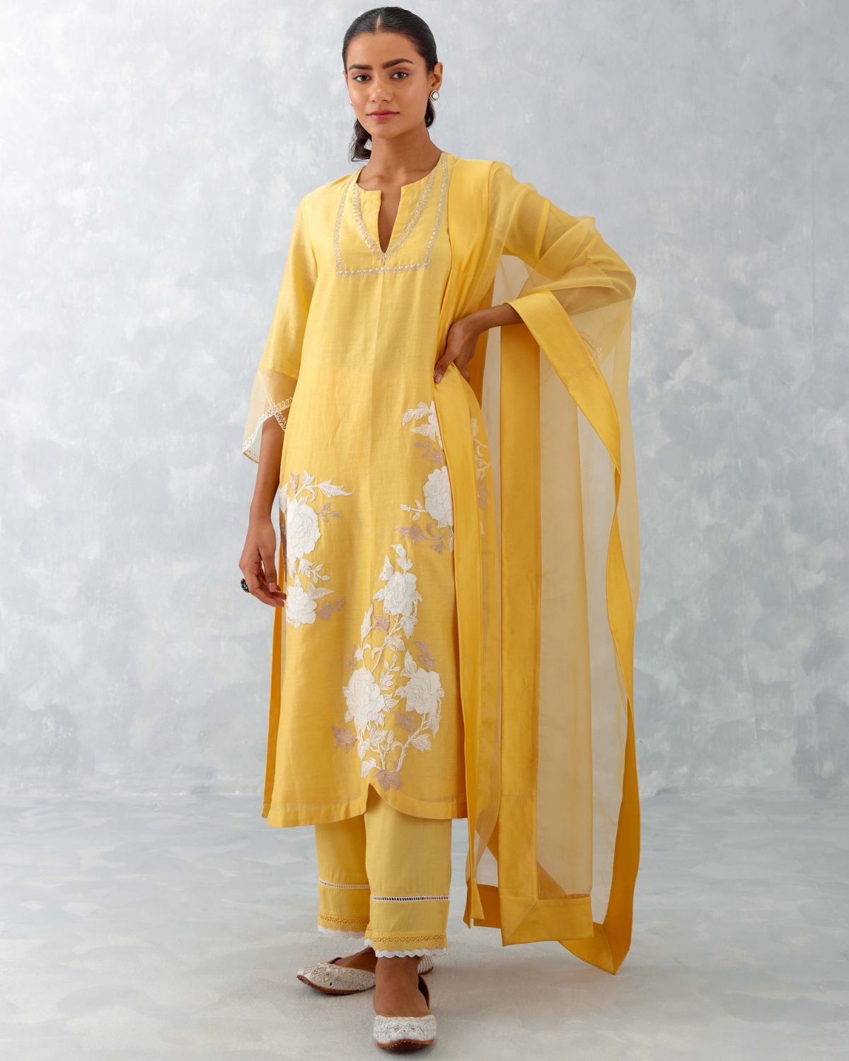 Ivory And Yellow Silk Chanderi Hand-Painted Embroidered Lehenga Set