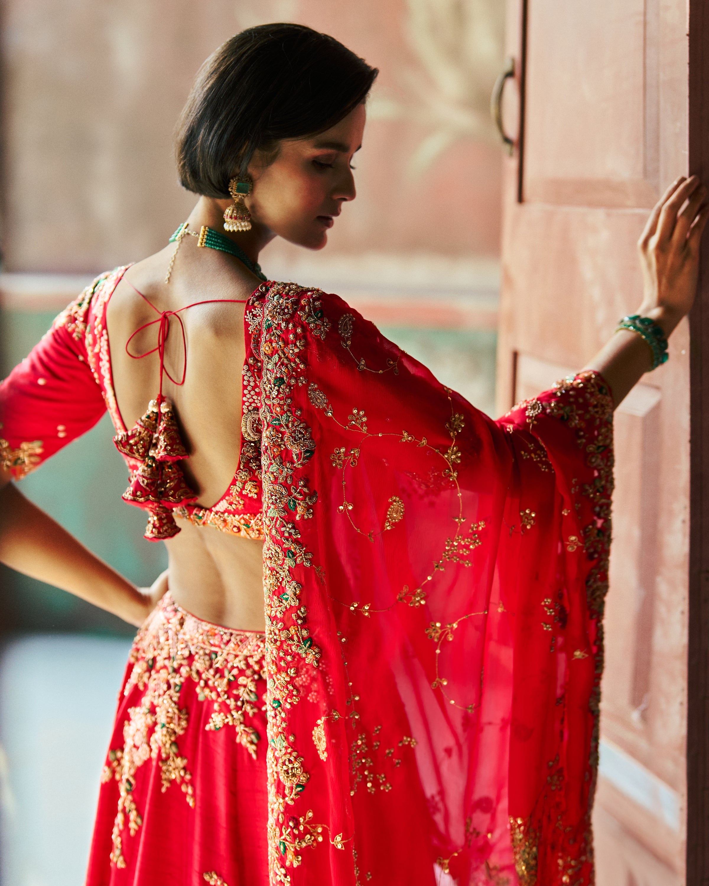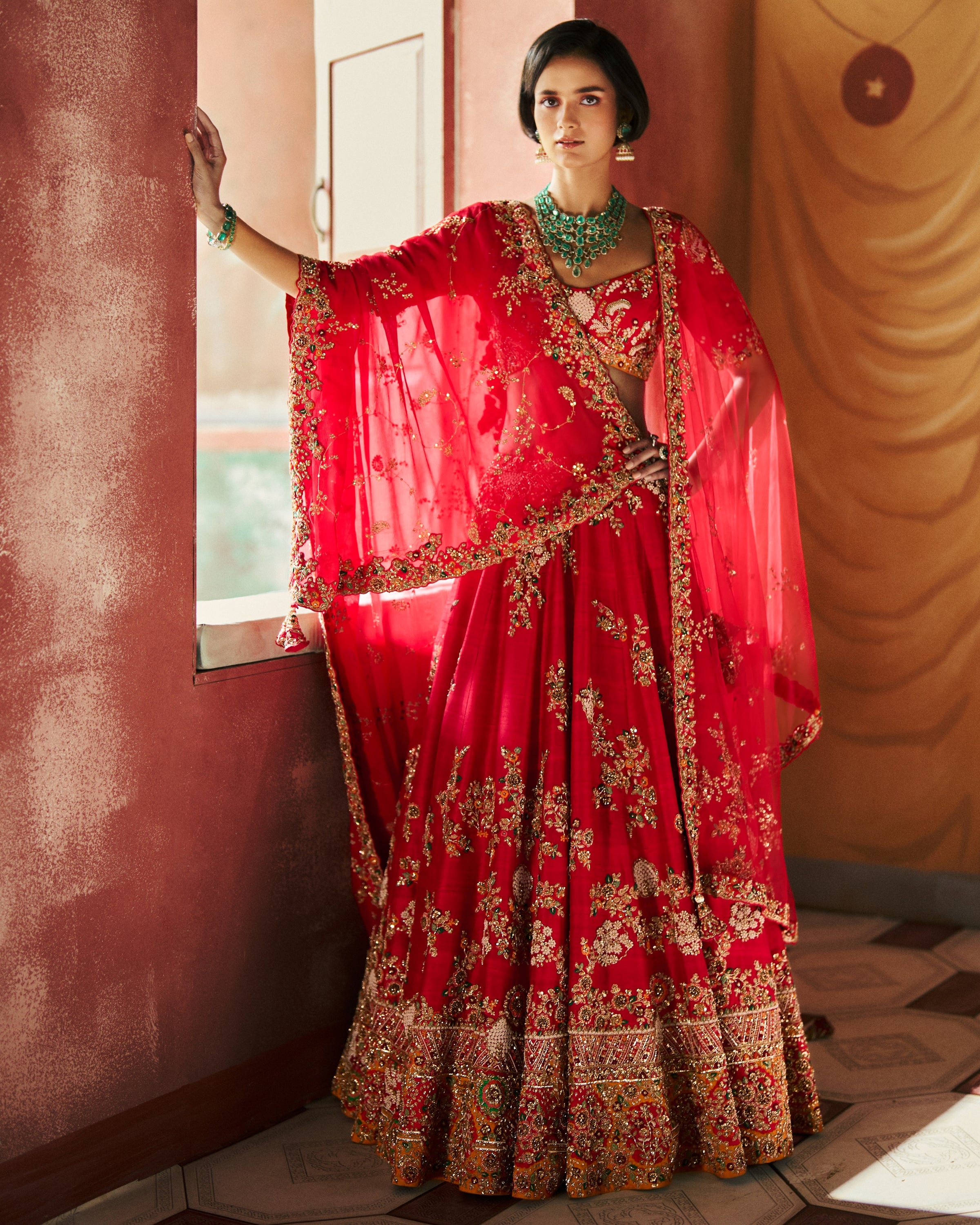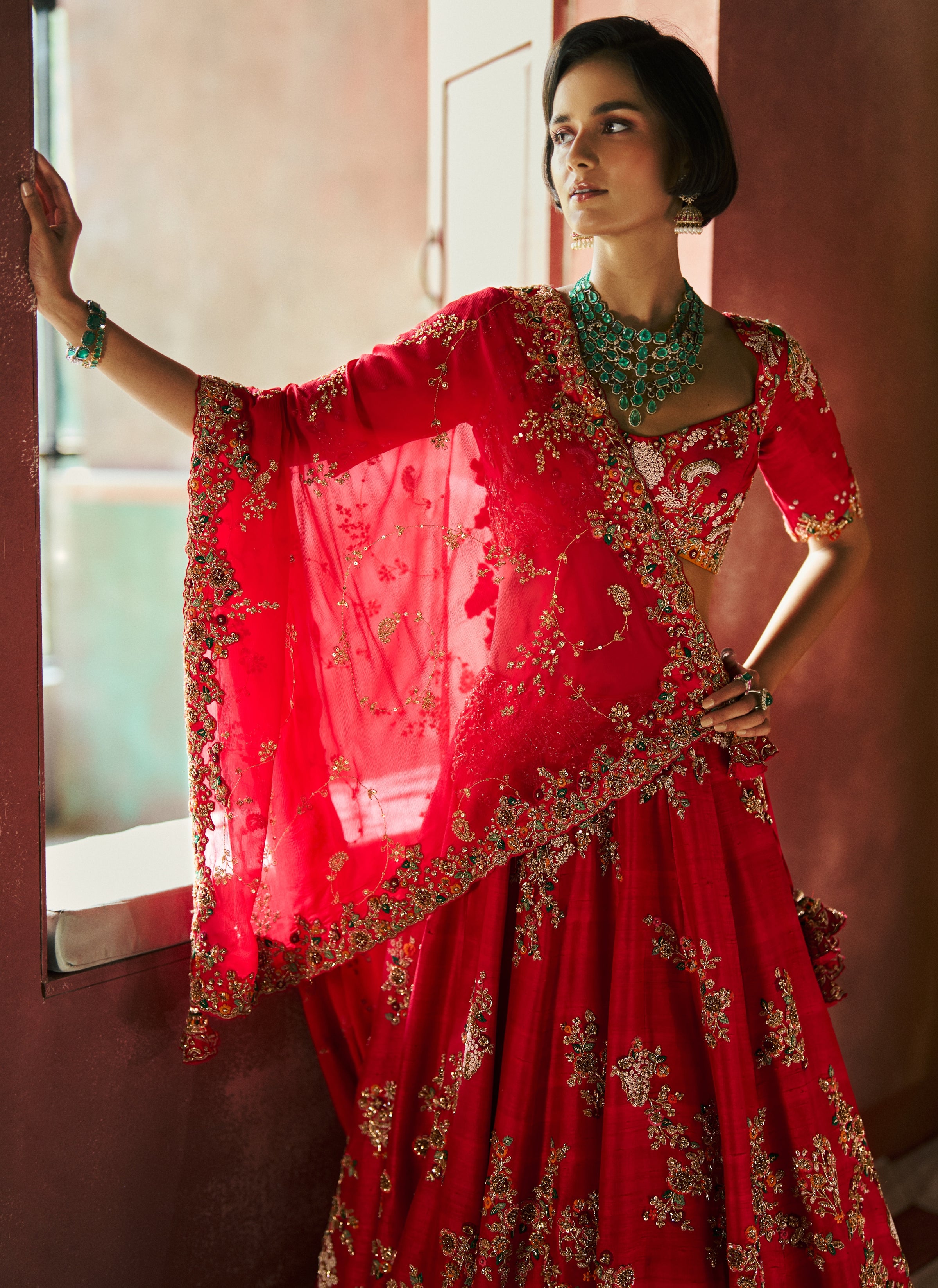 Elevate your bridal look with our Blushfire bridal lehenga set. This stunning piece features a vibrant crimson color, delicate net shoulder drape, and chiffon dupatta. The intricate threadwork in ivory and rouge adds a touch of heritage craftsmanship to your modern bridal look.