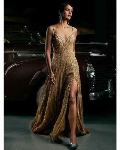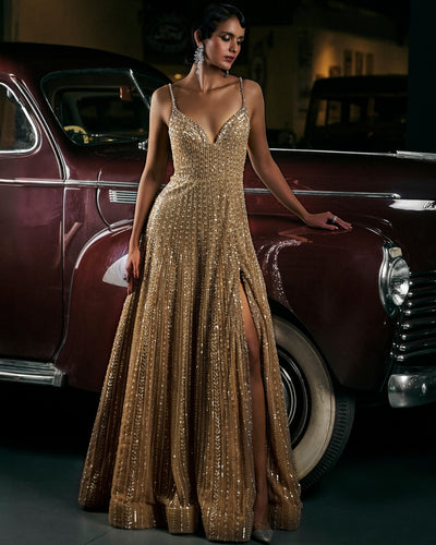 Feel like a movie star in our luxurious Caramel slit sequin gown. This stunning piece highlights a corset fit bodice with a plunging neckline, and features heavily embellished platinum cut sequin on a caramel net base for a glamorous touch. Complete with a high slit, this gown exudes elegance and sophistication.