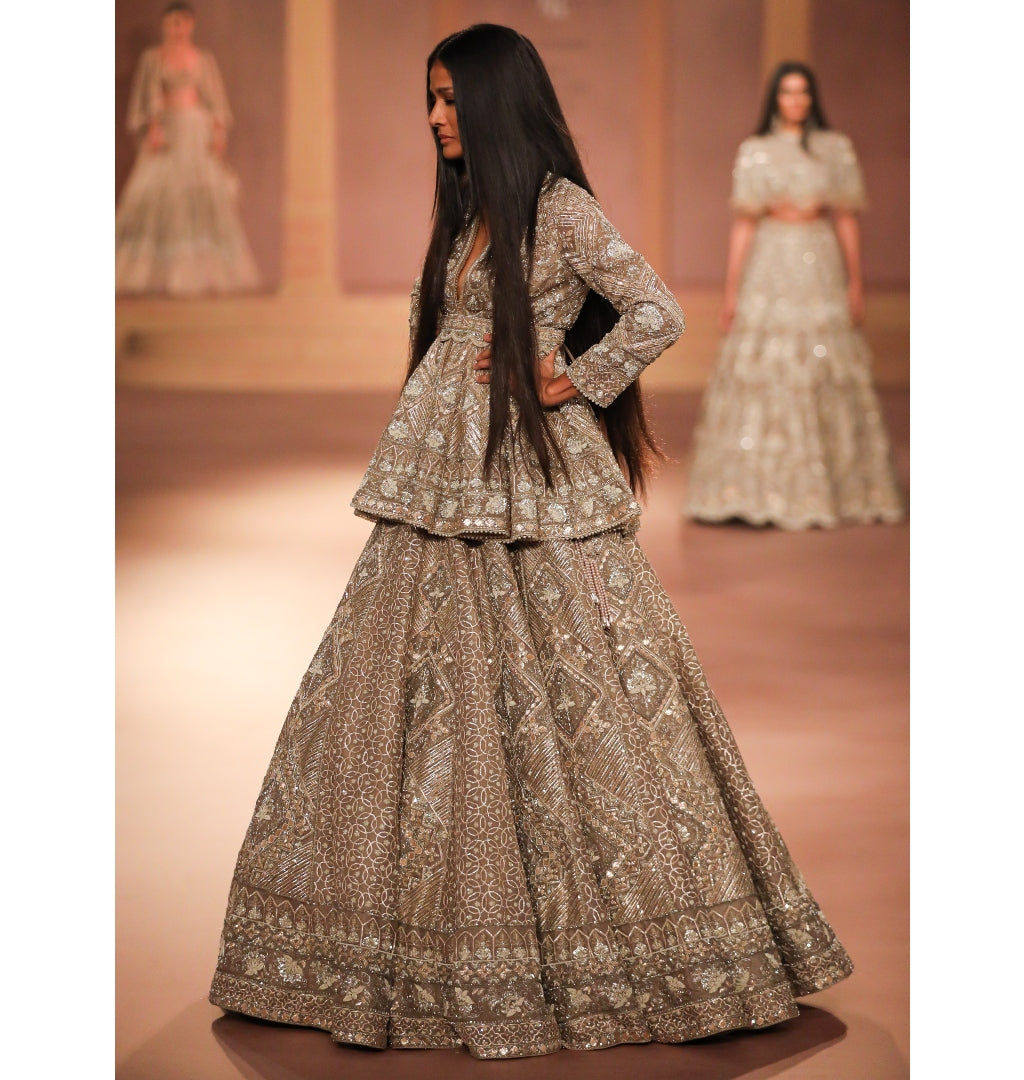 Elevate your style with our Carol peplum lehenga set. Crafted from luxurious organza and adorned with intricate gota embroidery, this set exudes sophistication. The peplum top completes the look with its elegant embroidery. Make a statement at any event with this exclusive ensemble.