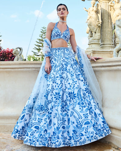Elevate your style with the Chapelle blue applique lehenga set. Featuring cobalt blue floral applique embroidery on a white net base, highlighted with sequins and delicate stones. The halter cut blouse has a back bow with tassels, paired with a matching dupatta. Step into sophistication with this exquisite set.