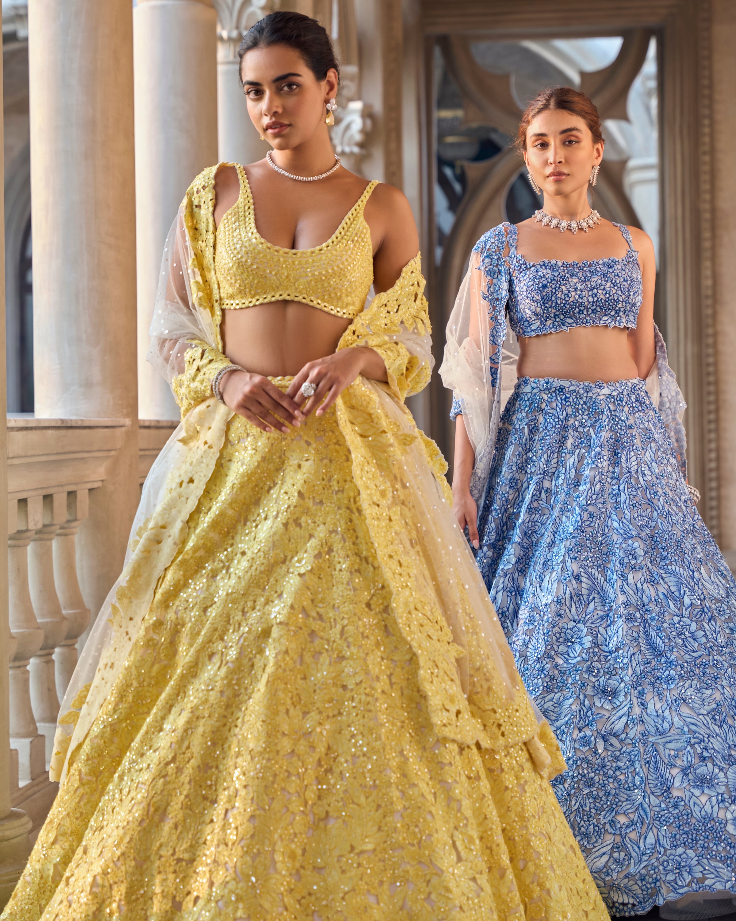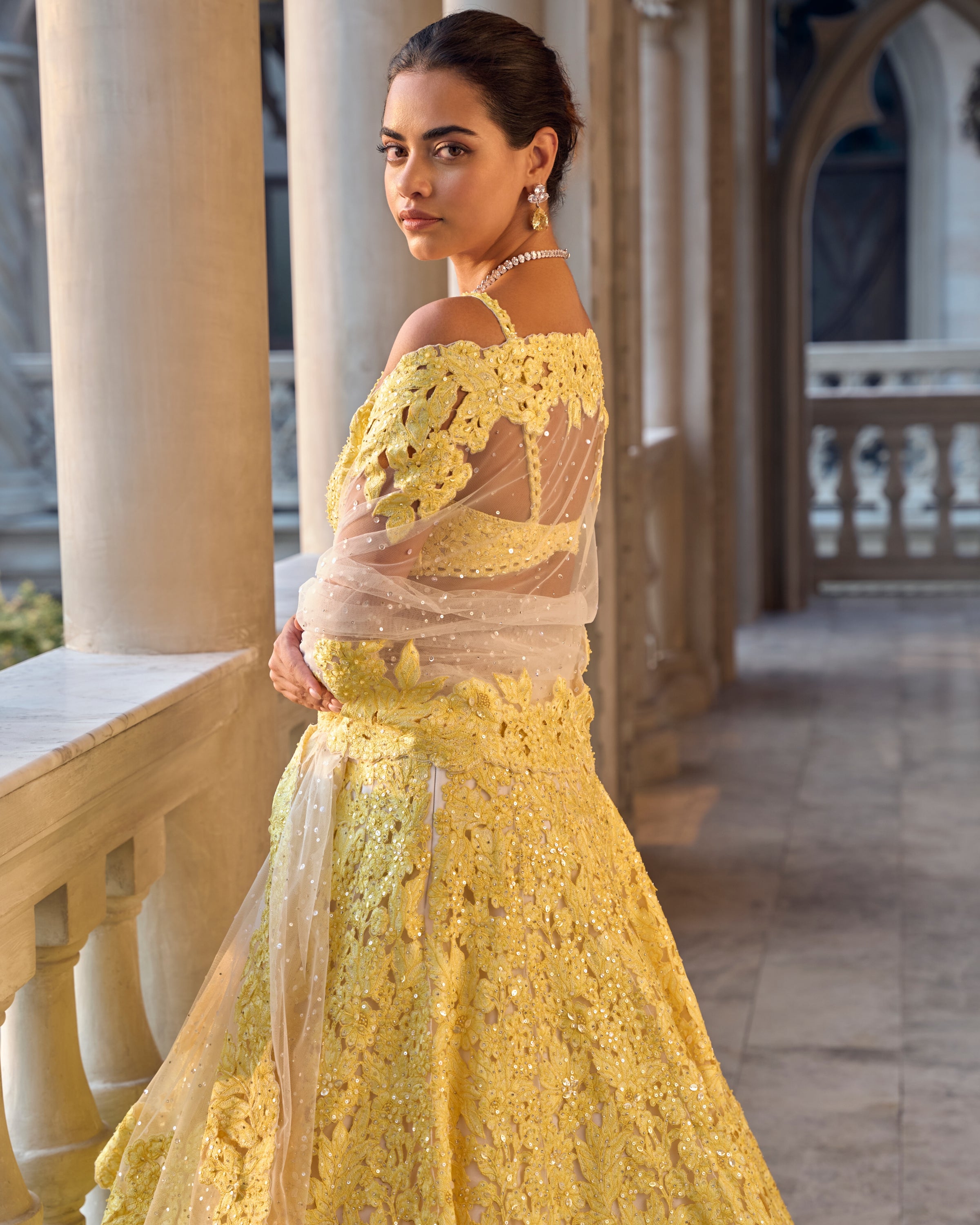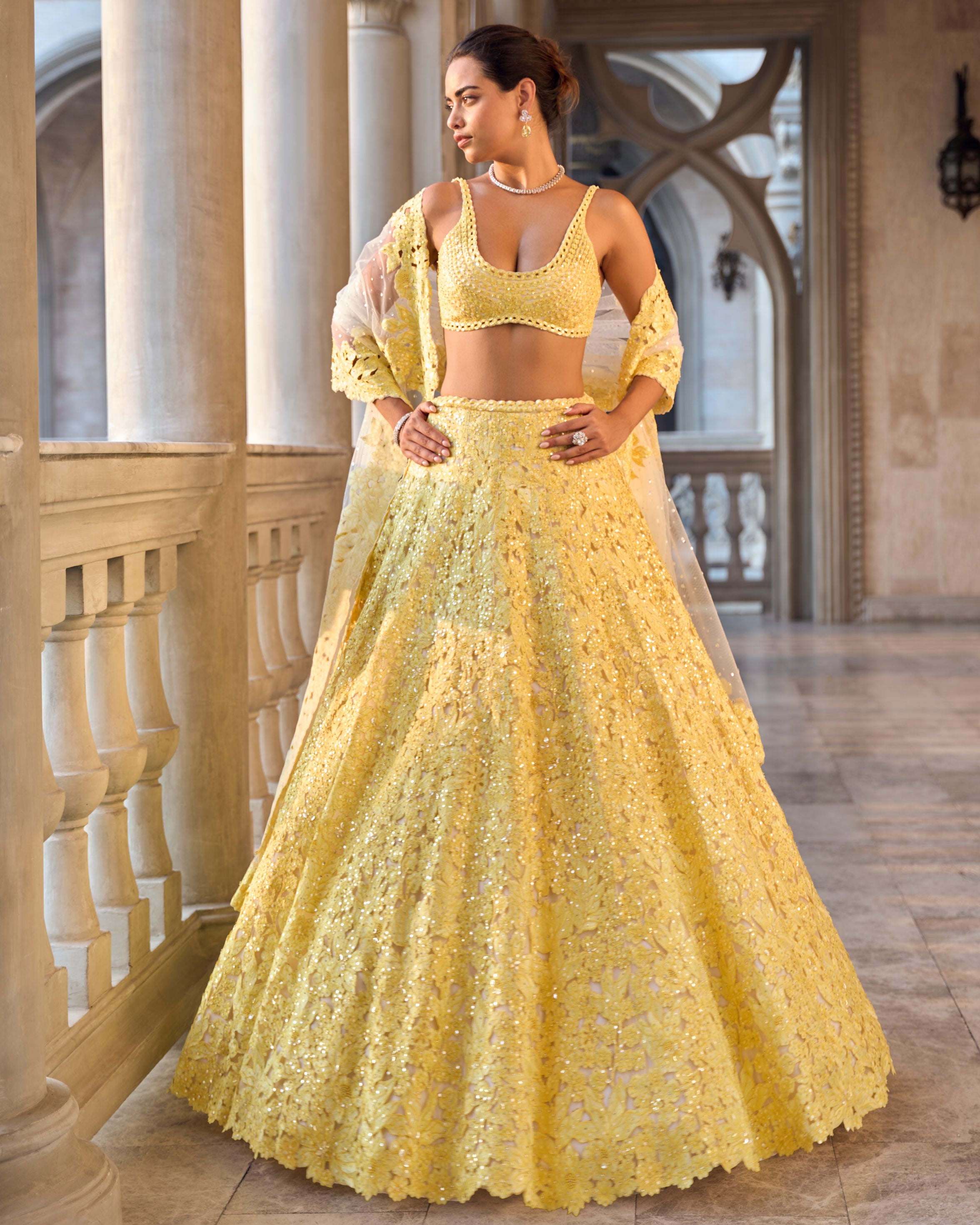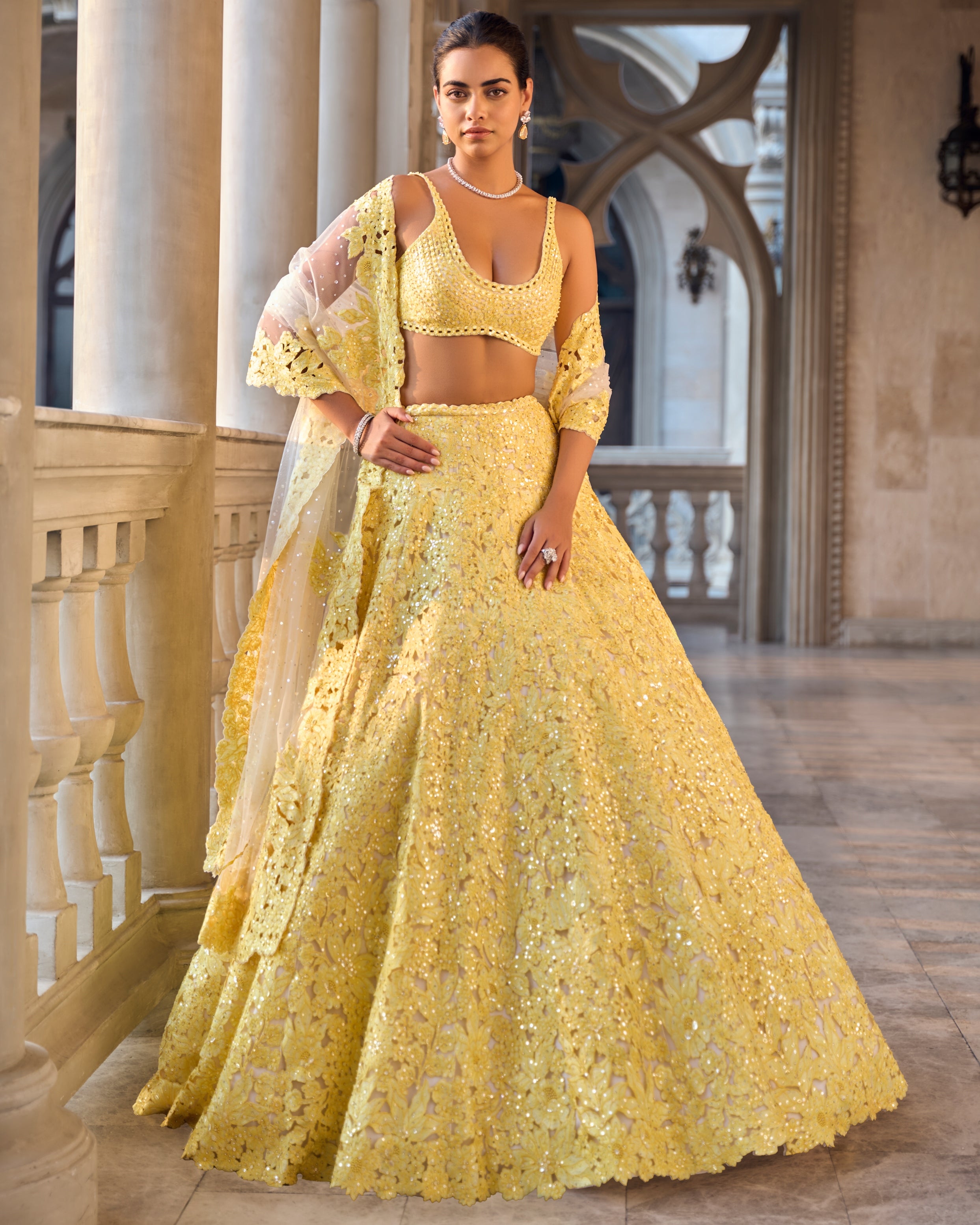 Expertly crafted with intricate powder blue floral embroidery, adorned with crystals, pearls, and sequins on a soft ivory base, the Chapelle yellow cut work lehenga set exudes elegant grace and charm. The scalloped waistline and crystal drop details add a touch of luxury, while the four-sided embroidered dupatta completes the ensemble. Perfect for special occasions, this lehenga set is a timeless addition to every wardrobe.