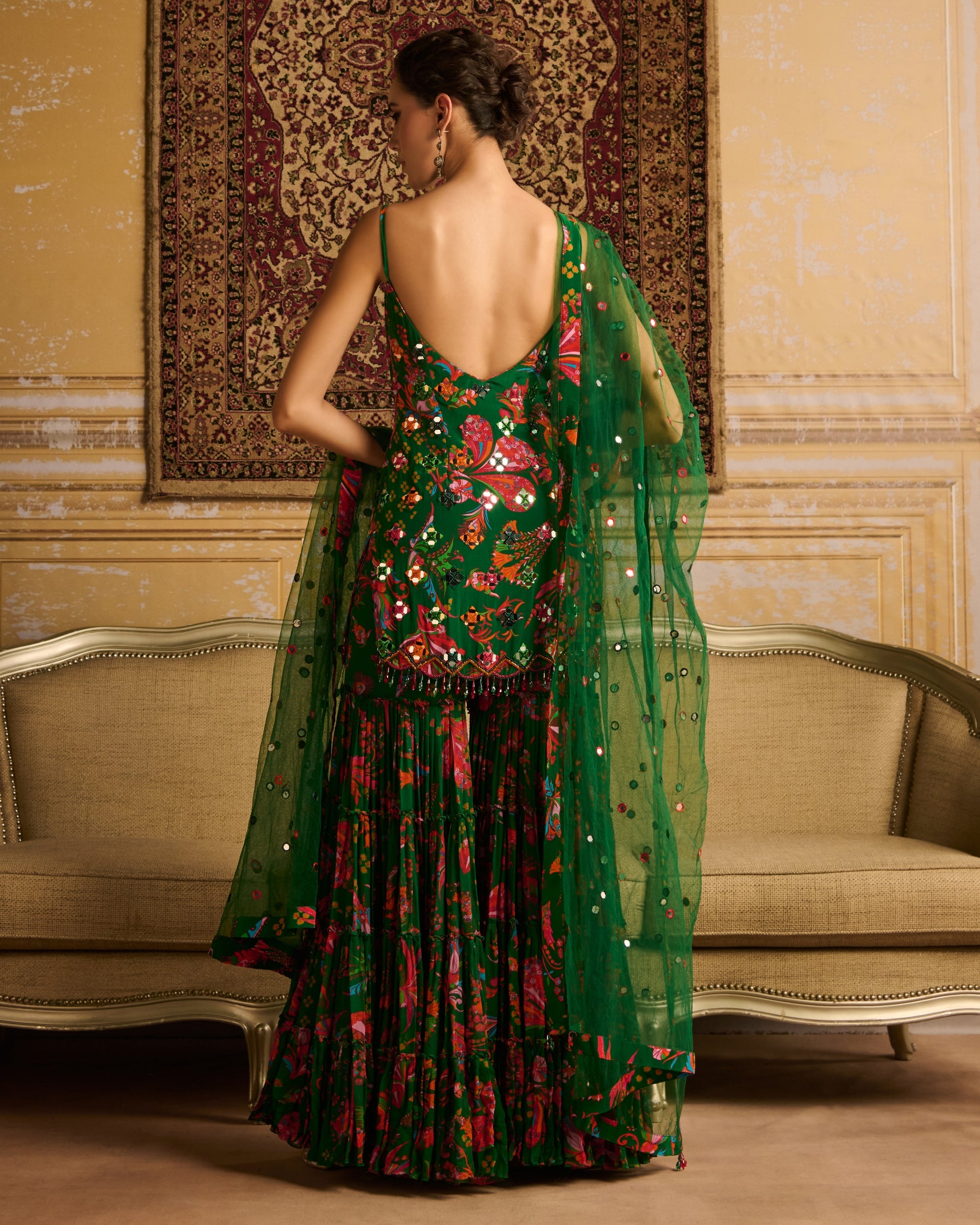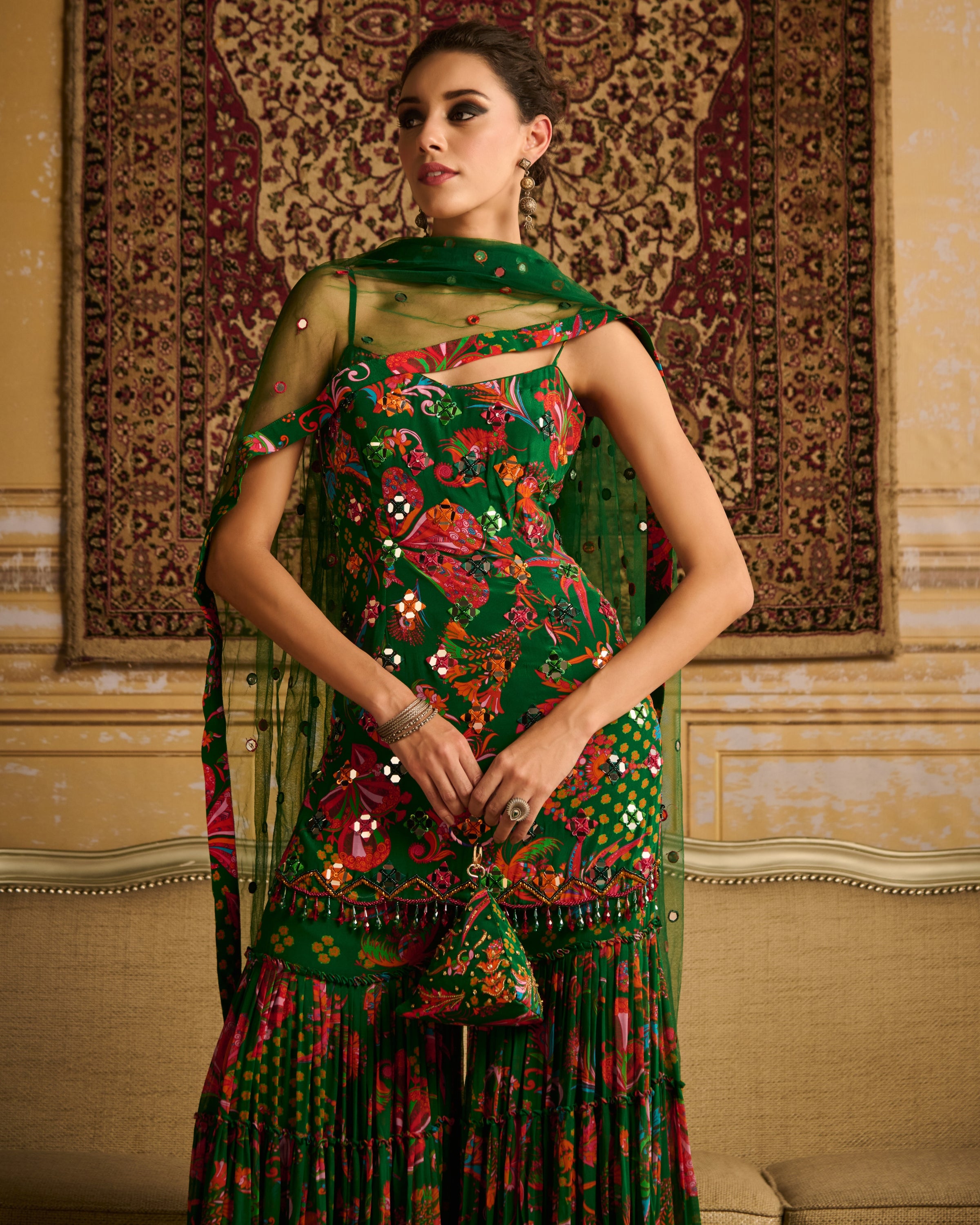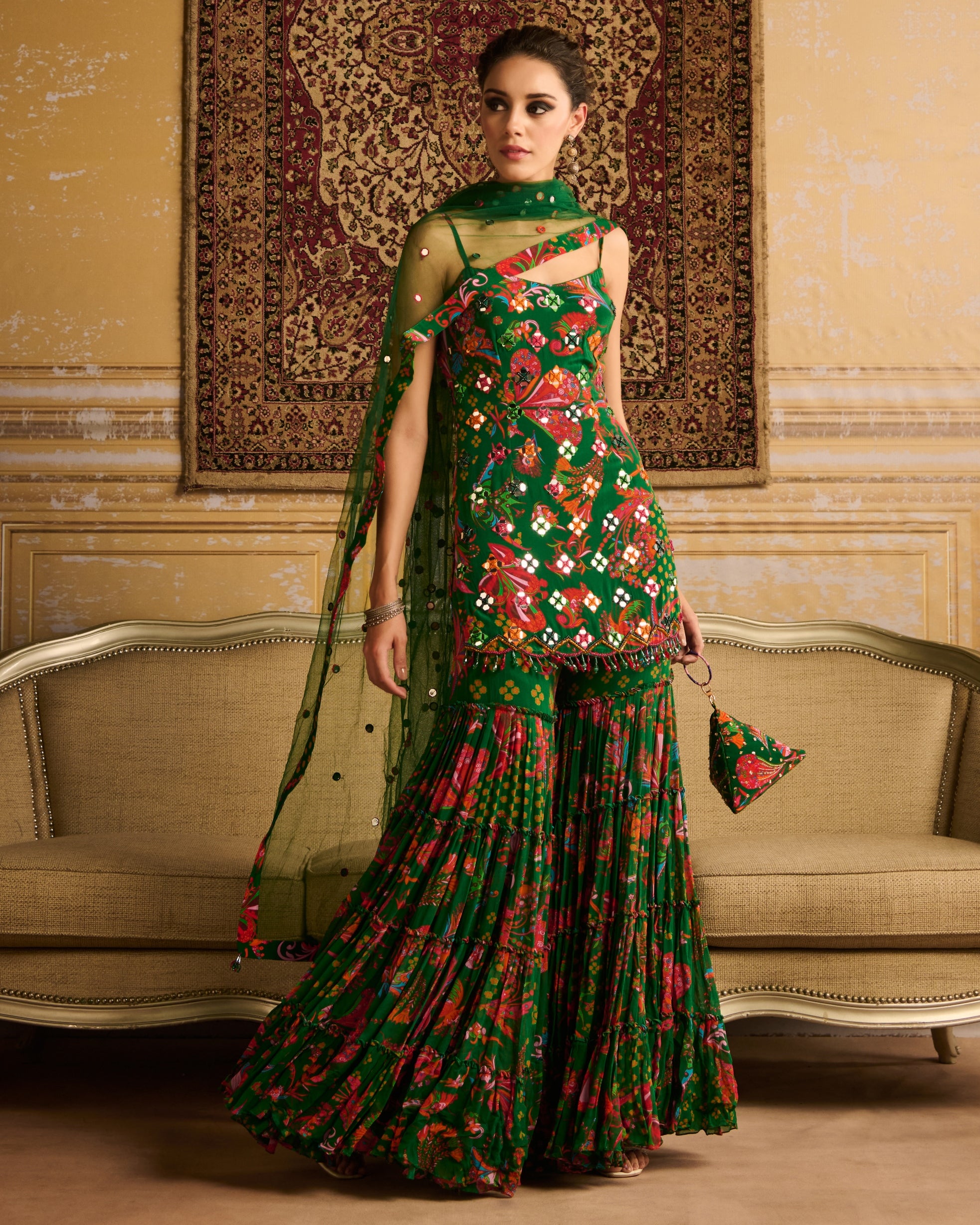 Explore the traditional beauty of our dark green embroidered kurti and gharara set. The cosmo floral jaal print and intricate embroidery give the kurti a touch of elegance. With a matching gharara and dupatta, you'll feel confident and stylish. Complete the look with the included triangle bag.