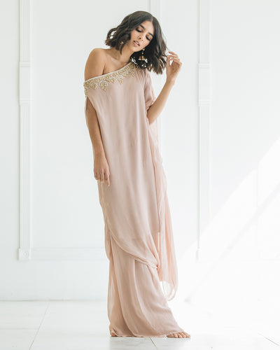The one-shoulder blush pink kaftan features hand-embroidered glass beads, pearls and sequins. Paired with palazzo pants.