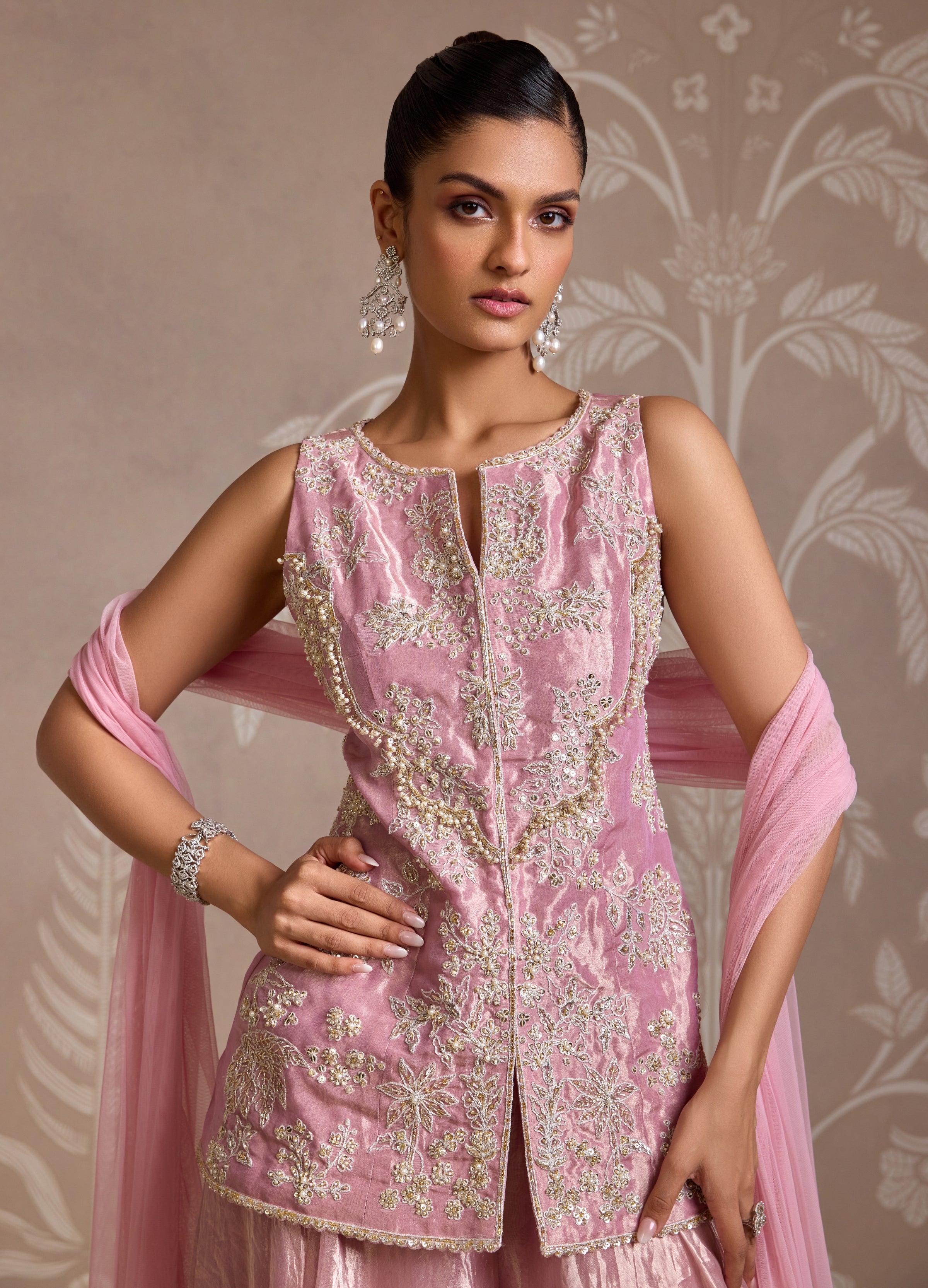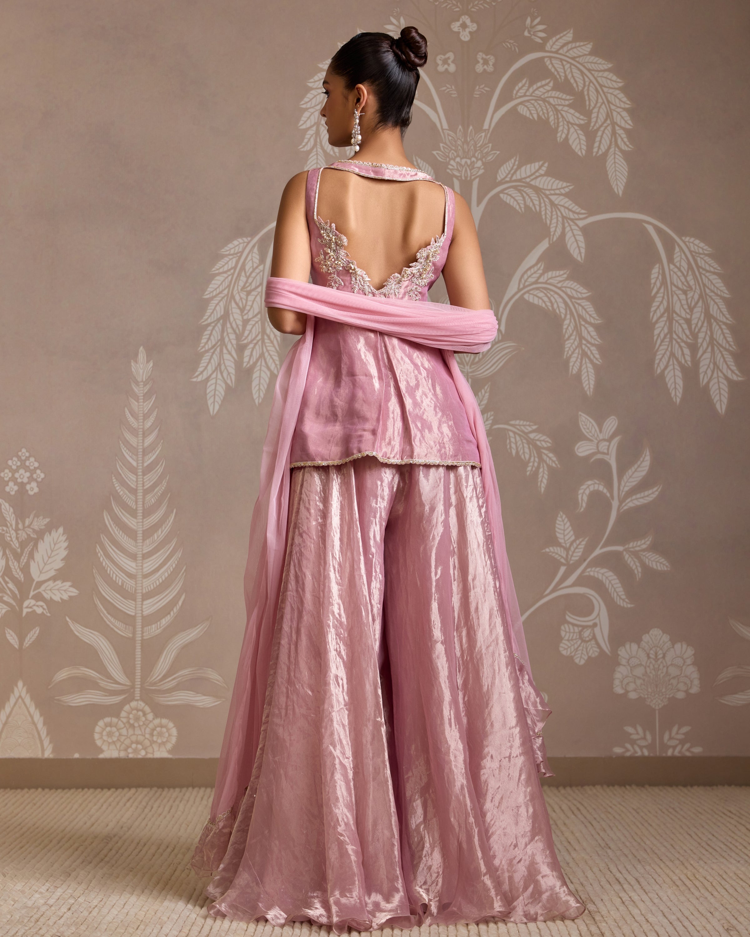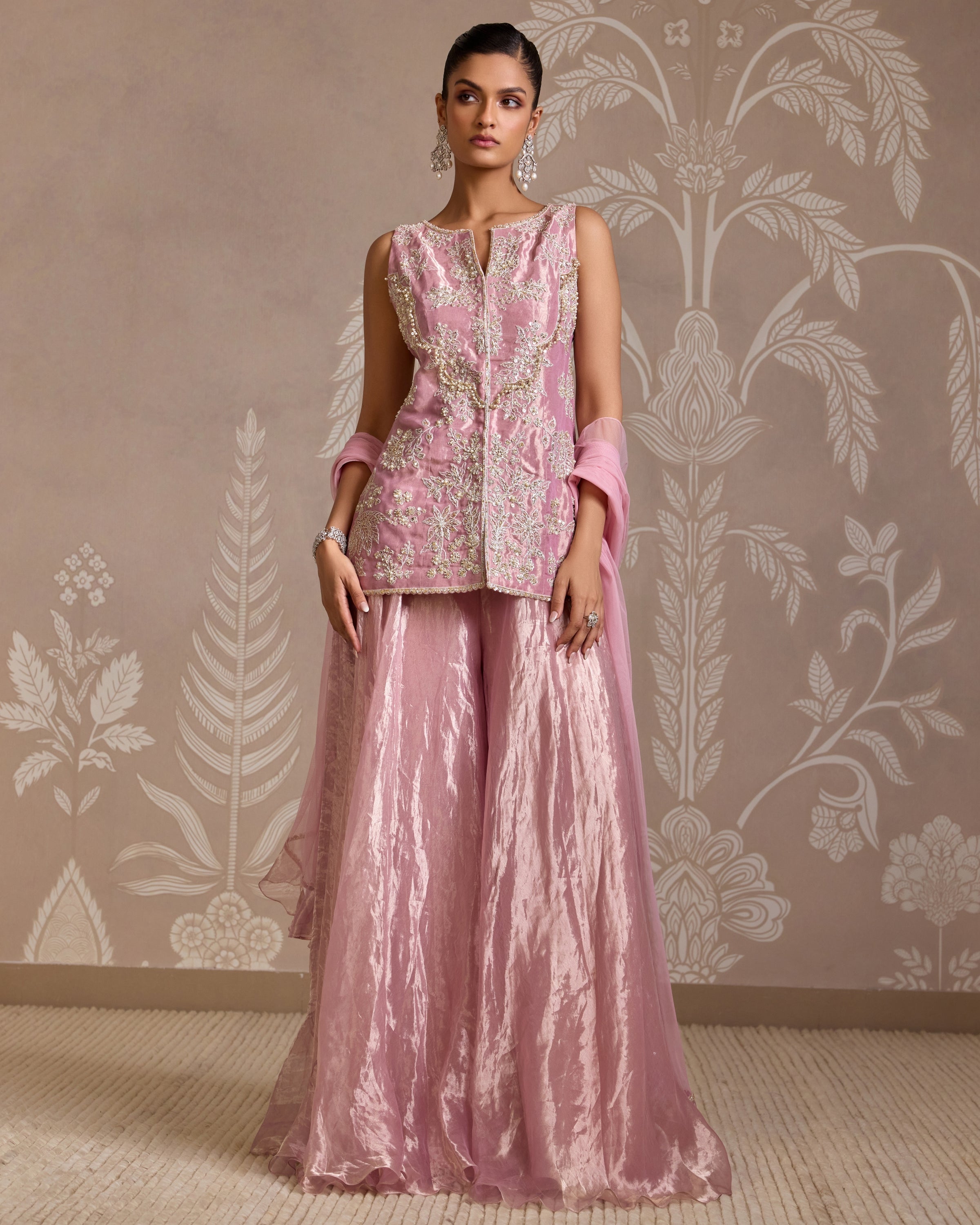 This Lilac gold furl sharara set features an allover embroidered tissue top, paired with a tissue sharara and net dupatta adorned with two side embroidered border and ruffles. Elevate your style with this elegant set, perfect for special occasions and events.