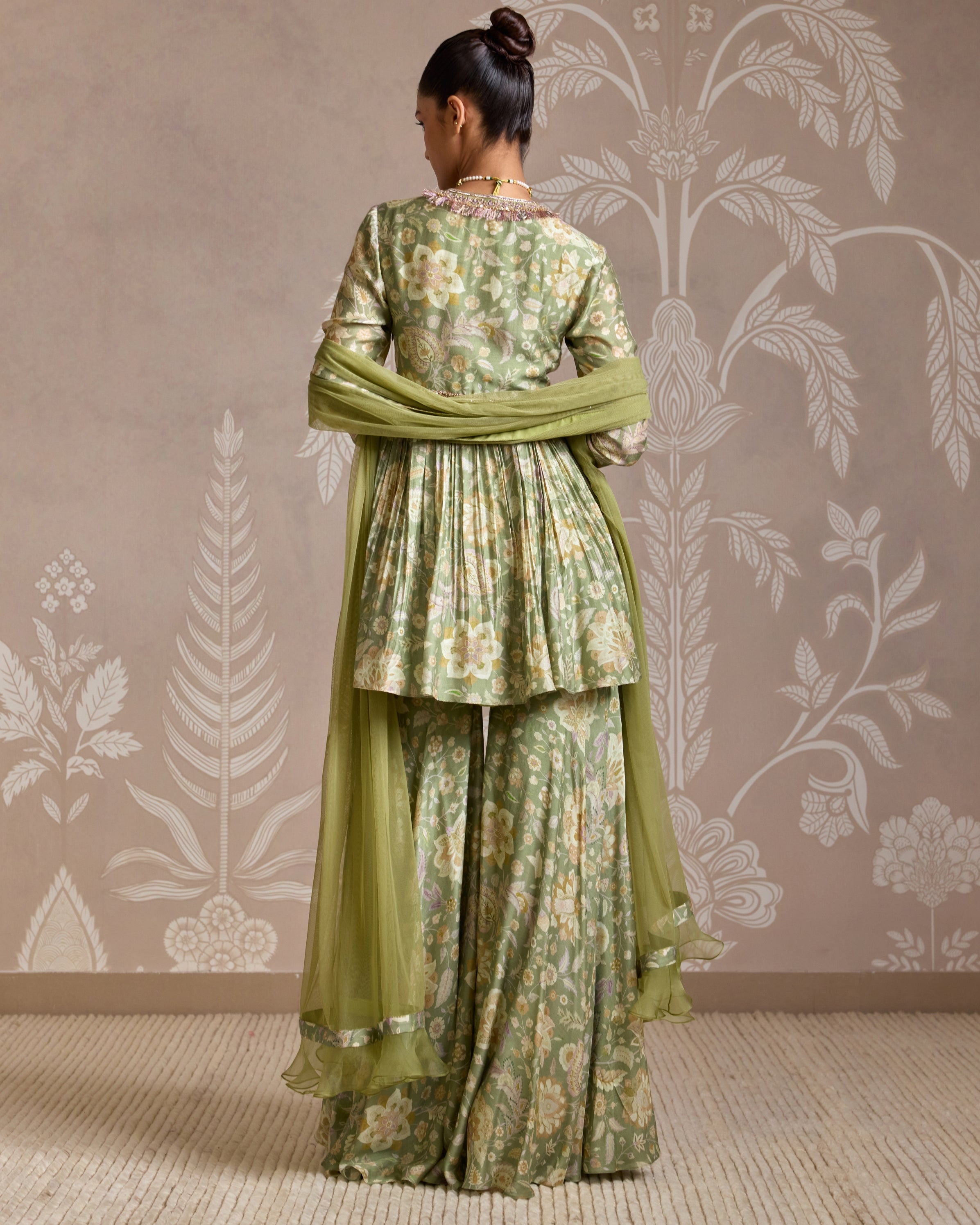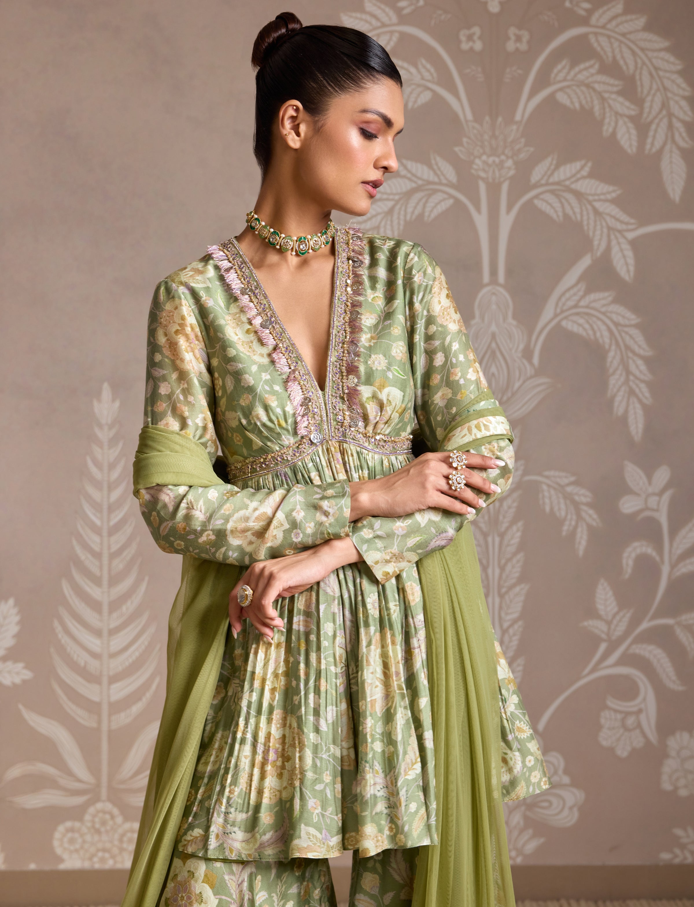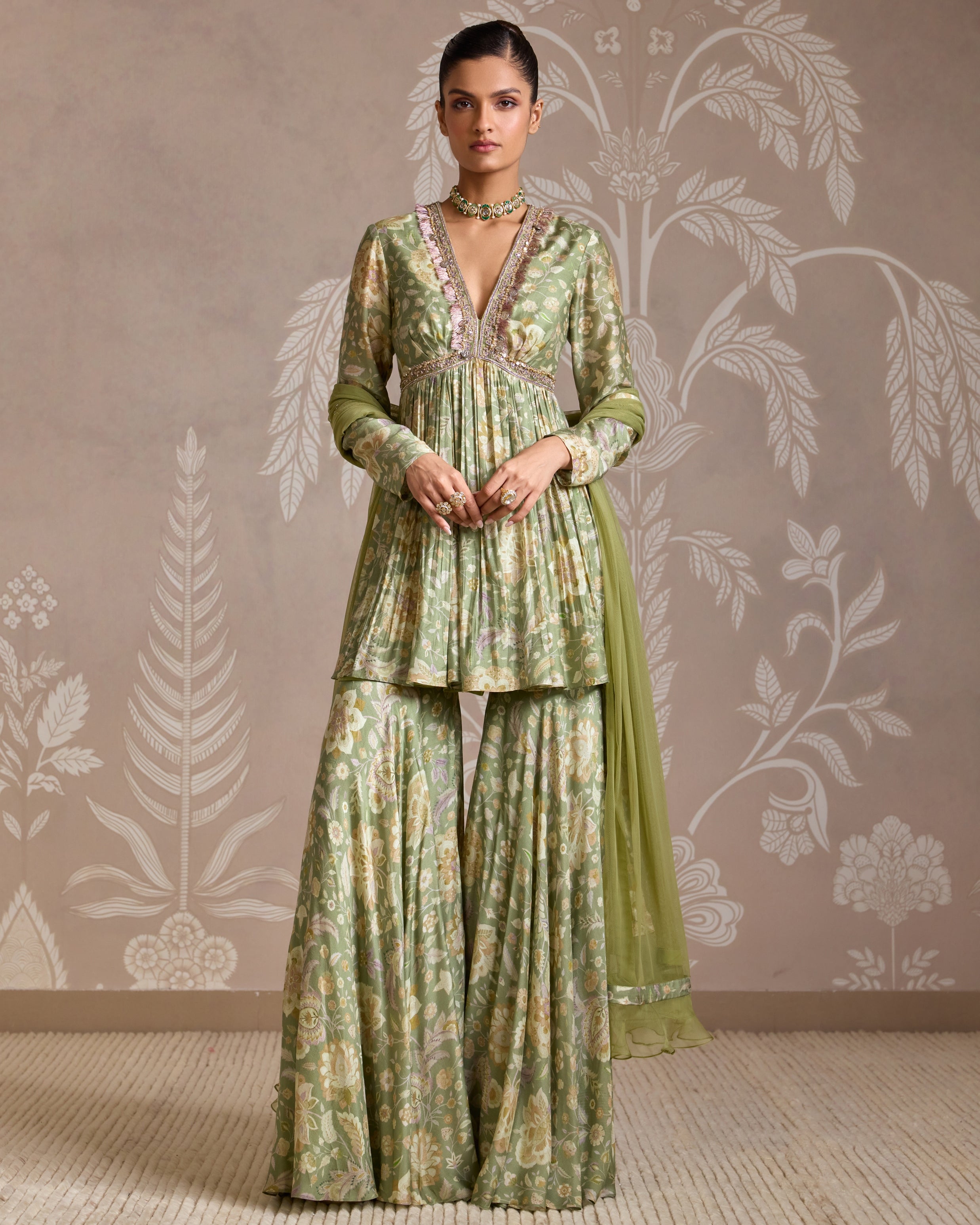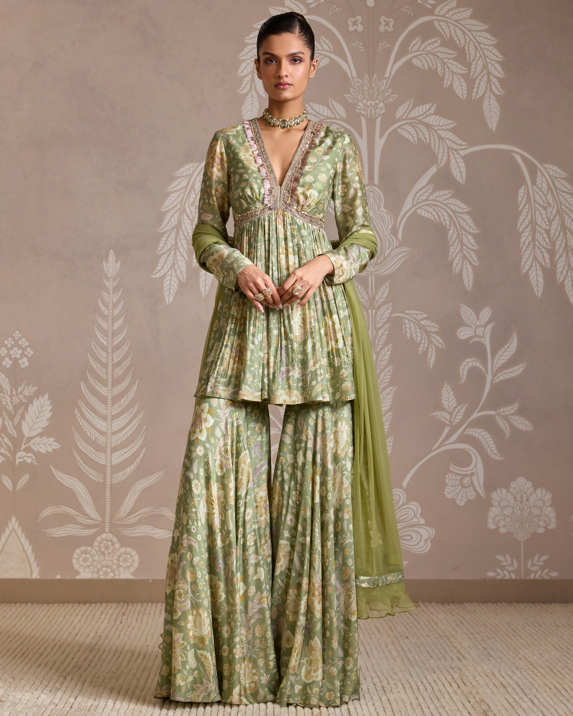 This Mint green fray gharara set features fine silk and net dupatta with a printed border. The placement embroidery adds a delicate touch, while the printed design offers a modern twist. Perfect for any special occasion, this set combines traditional and contemporary elements for a unique and elegant look.