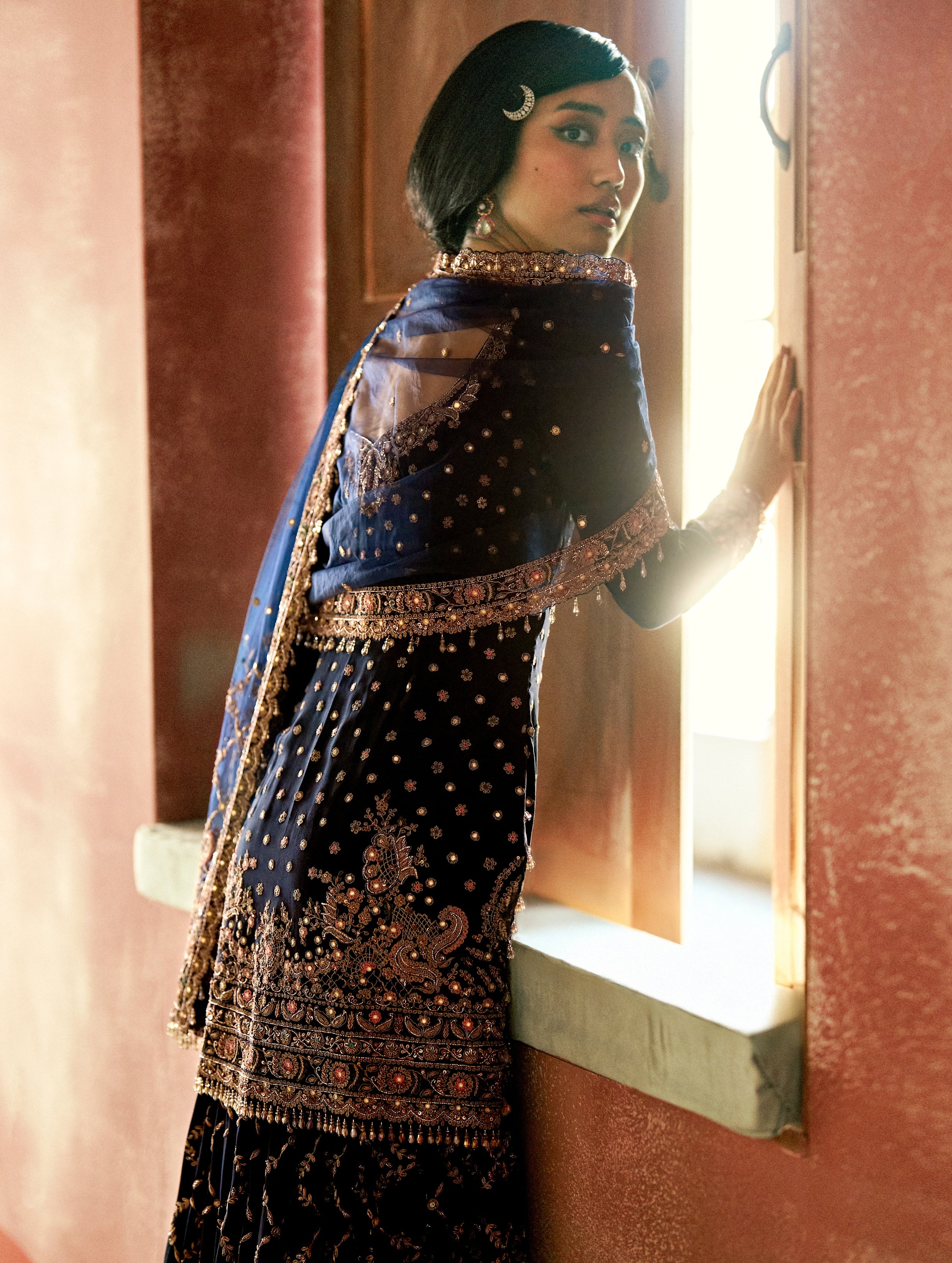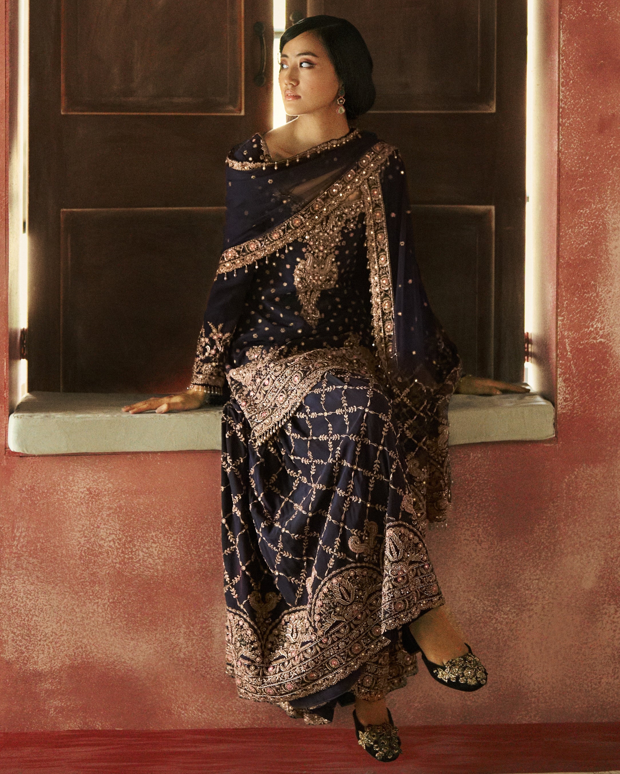 Discover the epitome of elegance with the Mirelda sharara set. Crafted from luxurious crepe, this set features stunning dull gold trellis embroidery and hand-embellished borders that showcase regal artistry. The gossamer tulle dupatta adds a touch of contemporary glamour to this timeless ensemble.