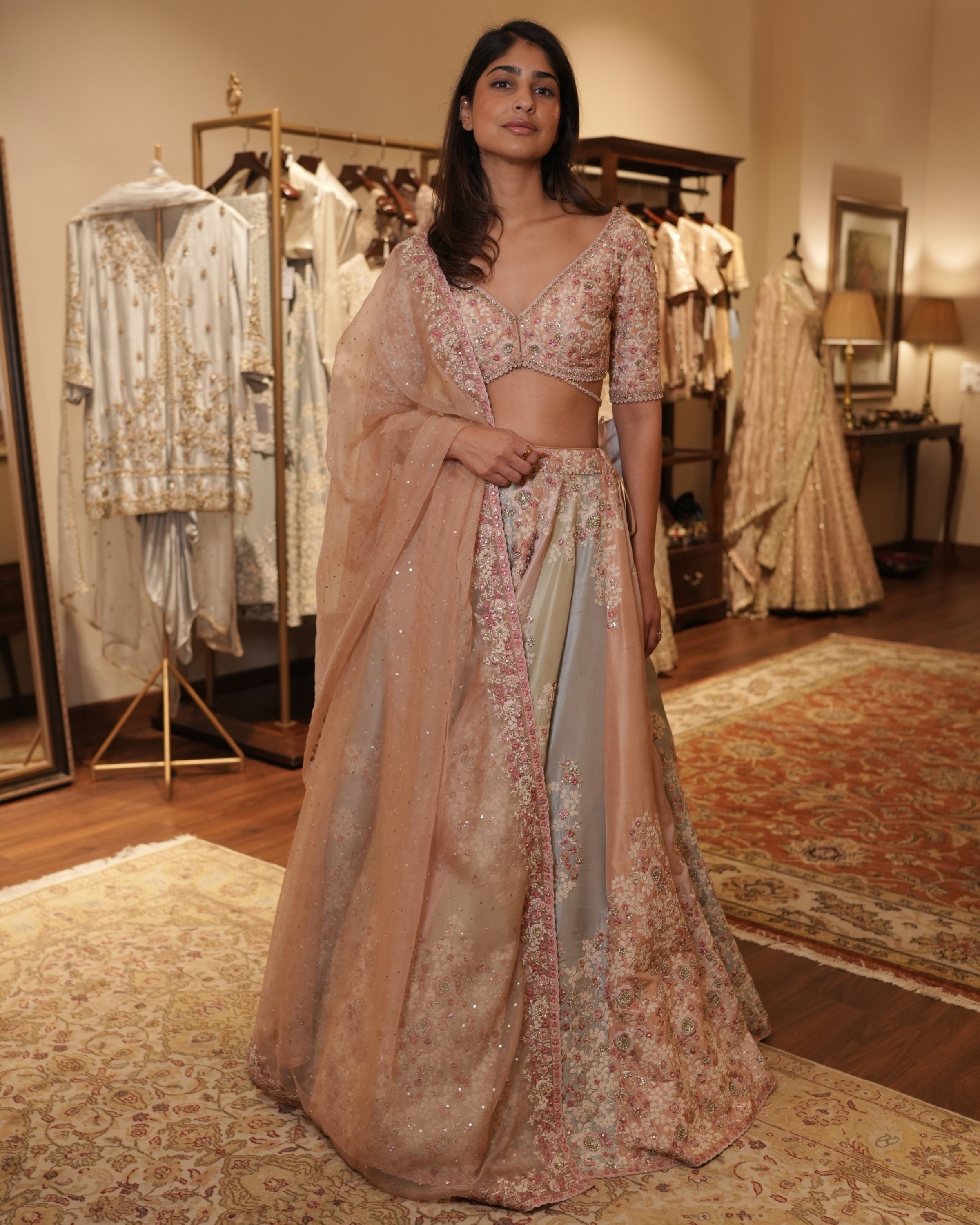 Indulge in luxury with our Multi-coloured panels dori work lehenga set. Made of dupion silk, this set boasts elegant grey-blue, mint green, pink, and peach panels. The intricate dori embroidery in ivory and shades of pink, accentuated with dabka and moti work, adds an artful touch. Elevate your style with this exclusive piece.