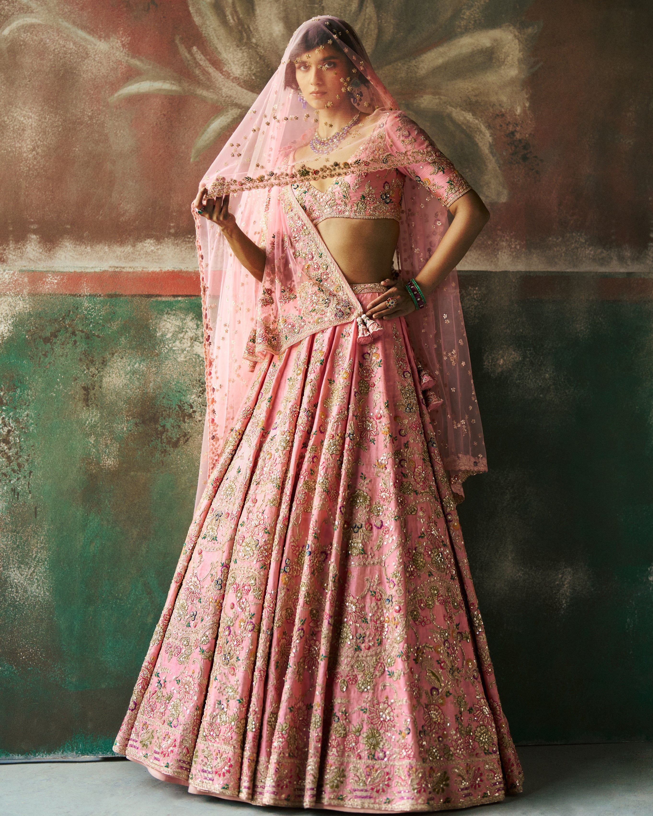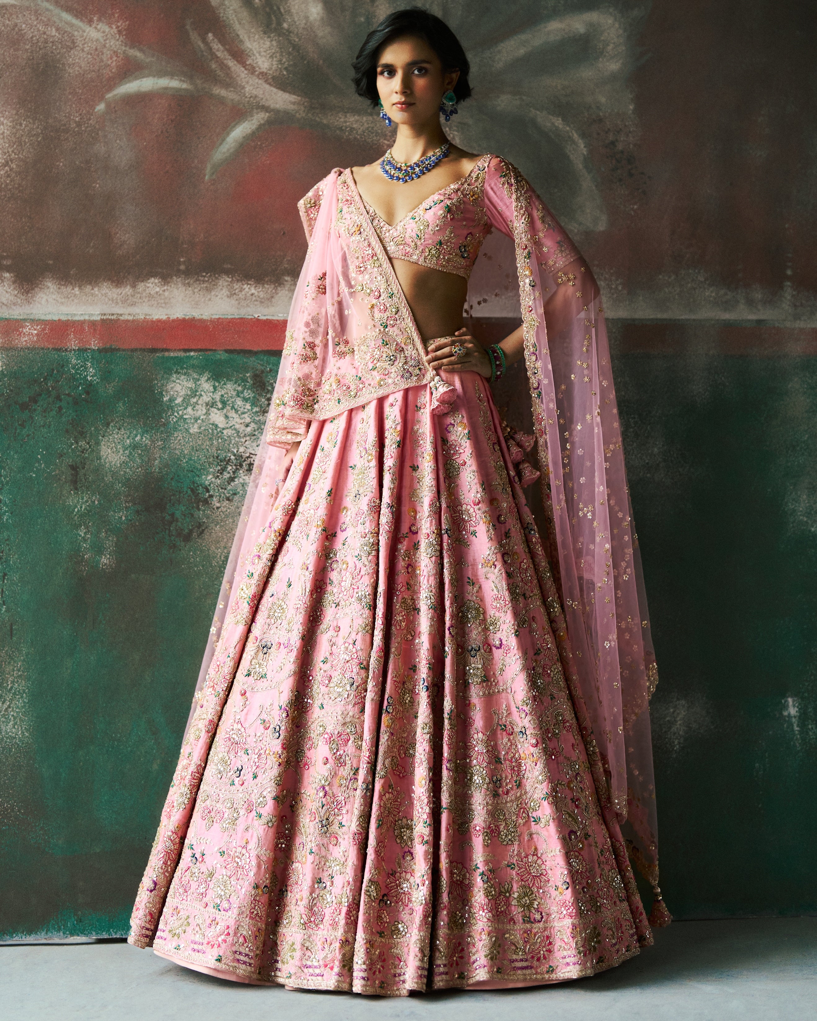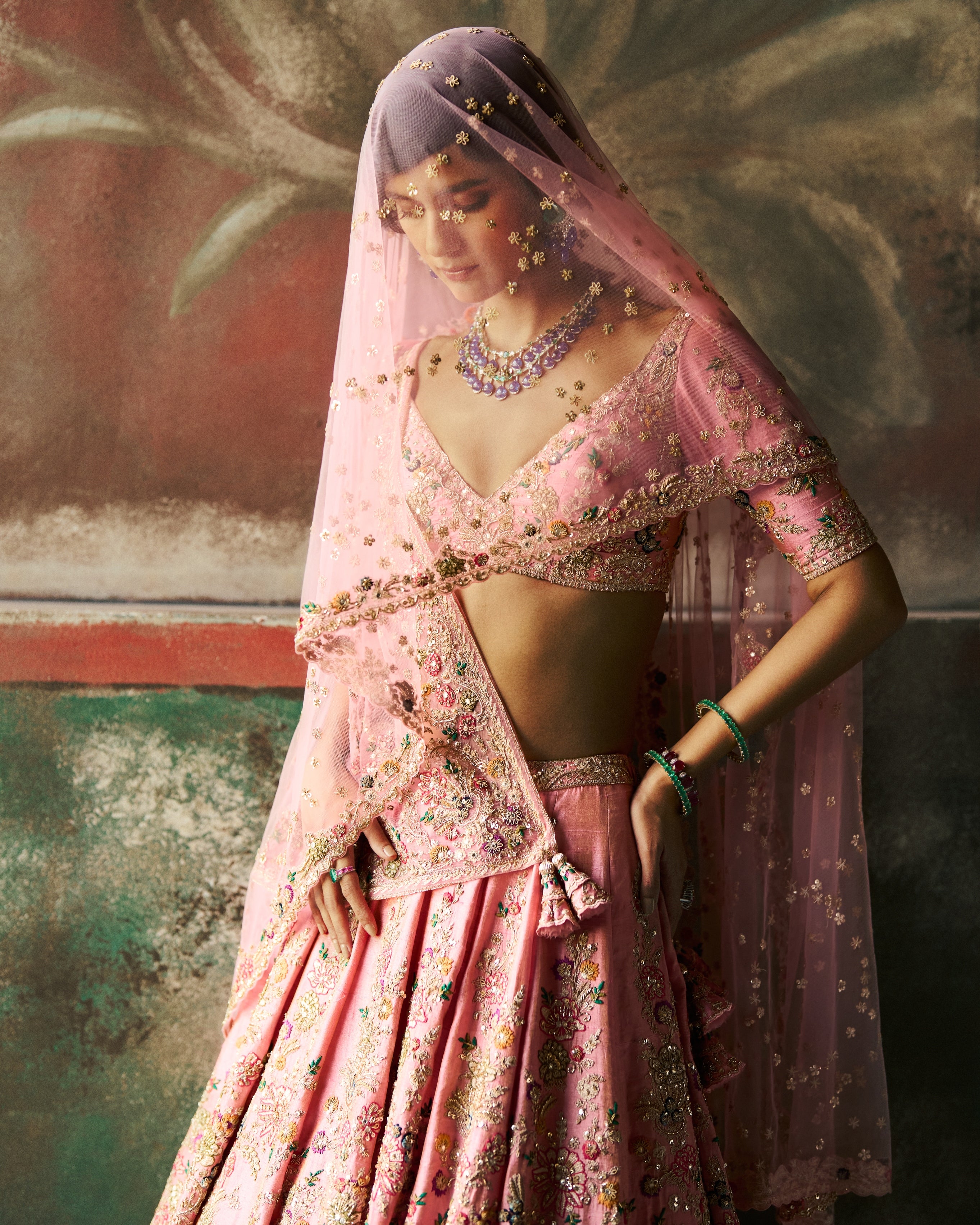 Expertly crafted with delicate rose quartz raw silk, this Petalure bridal lehenga set exudes elegance and grace. The intricate dori and zardozi embroidery adds a touch of opulence. Perfect for the modern bride seeking a blend of finesse and grandeur on her special day. Includes two airy net dupattas.