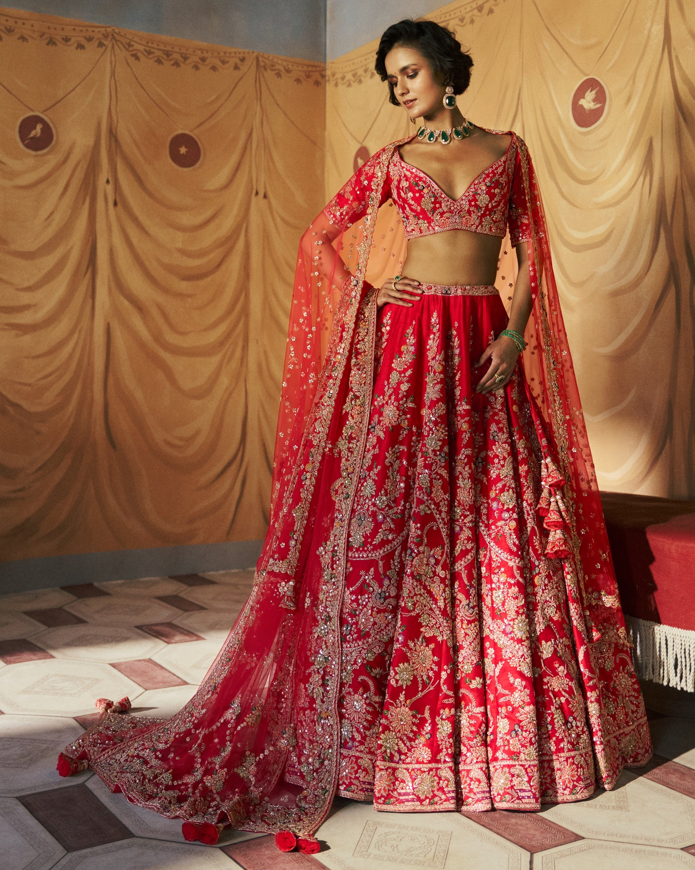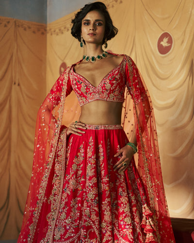 Embrace royal elegance with the Ravaya bridal lehenga set. Adorned with heirloom embroidery, this set is a masterpiece in molten ruby tones. The twin tulle veils and dupatta add texture, making it a perfect choice for any regal occasion. Let this set be your ode to timeless charm and romance.