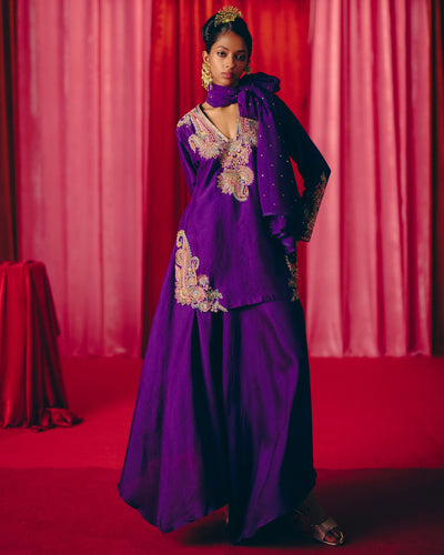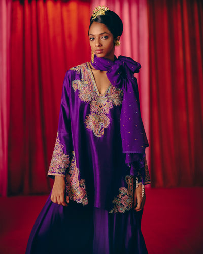 Pure silk purple kurta, adorned with intricate paisley artwork in multicolor resham and zardozi hand embroidery along the neckline, hem, and sleeves. Paired with satin kaftan pants and a chiffon dupatta featuring pearl tassels, crochet lace, and scattered bandhani patterns.