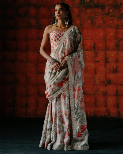 Elevate your traditional indian attire with the sonali pearl pre draped sari set. This stunning set features a pearl printed corset that accentuates your figure, while the printed fishtail pre-stitched sari adds a touch of elegance. Complete with an embroidered waistband, this set is the perfect combination of modern and traditional.