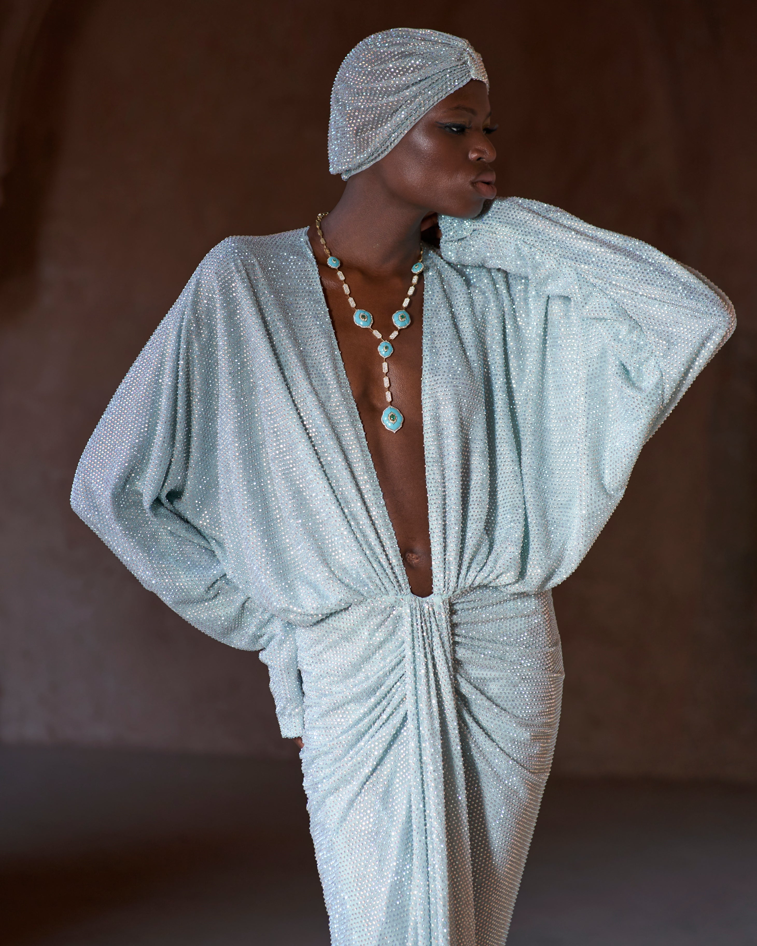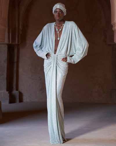 Introducing the Taleemah gown - a stunning kaftan-style gown with mint green crystal embellishments. The lantern sleeves and ruched bottom add elegant touches, while the matching headgear accessory completes the look. Elevate your style with this luxurious gown.