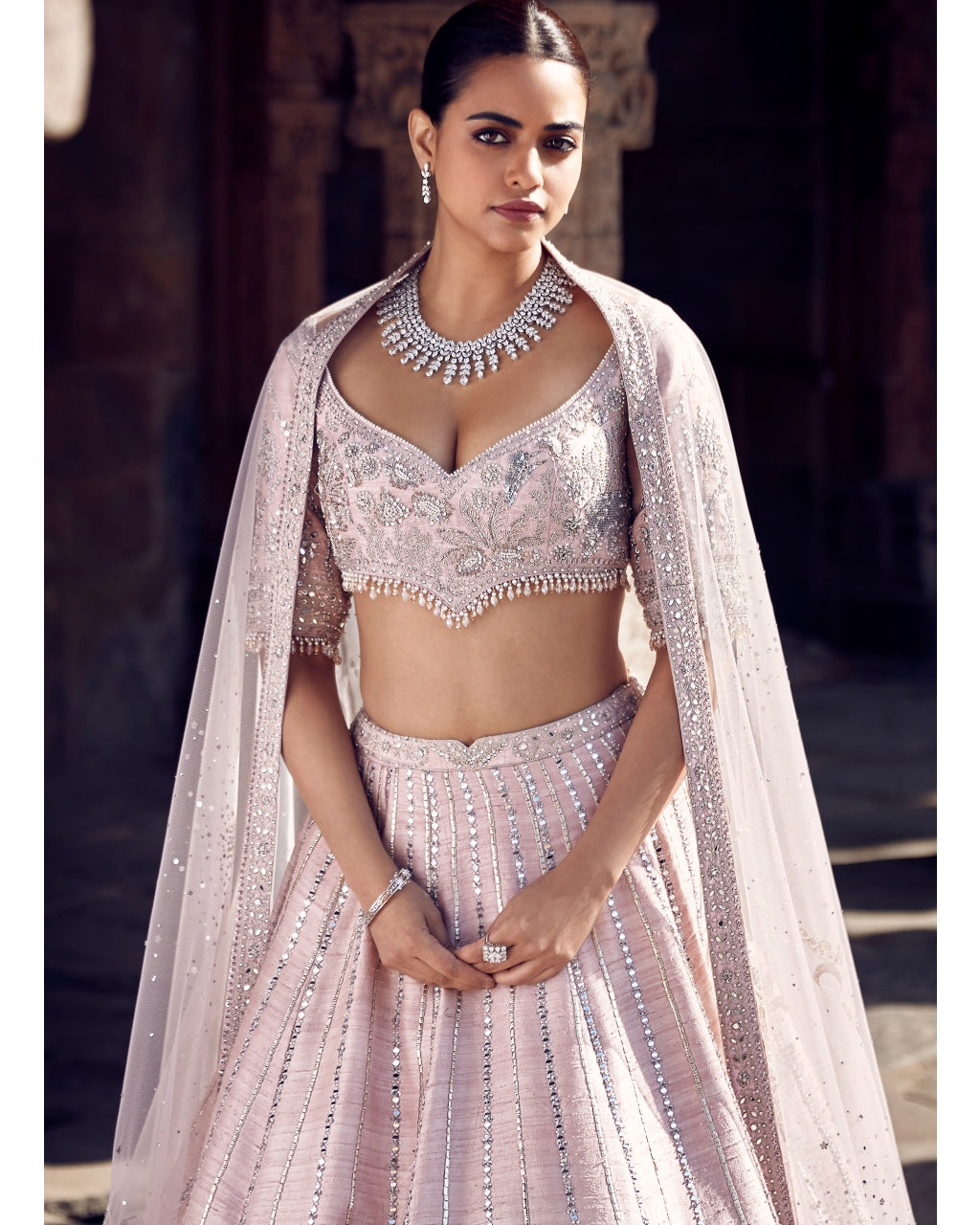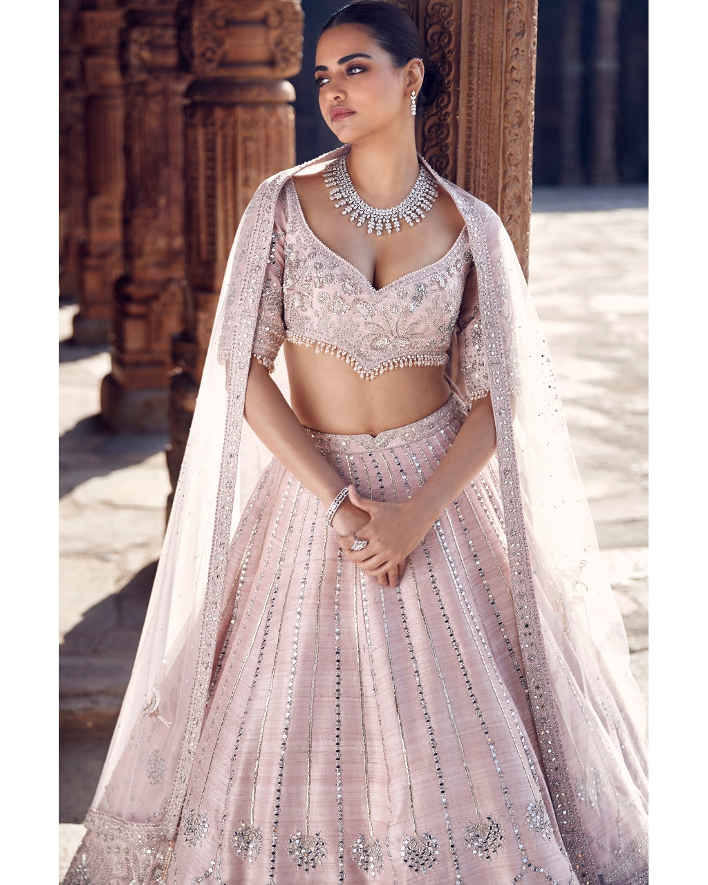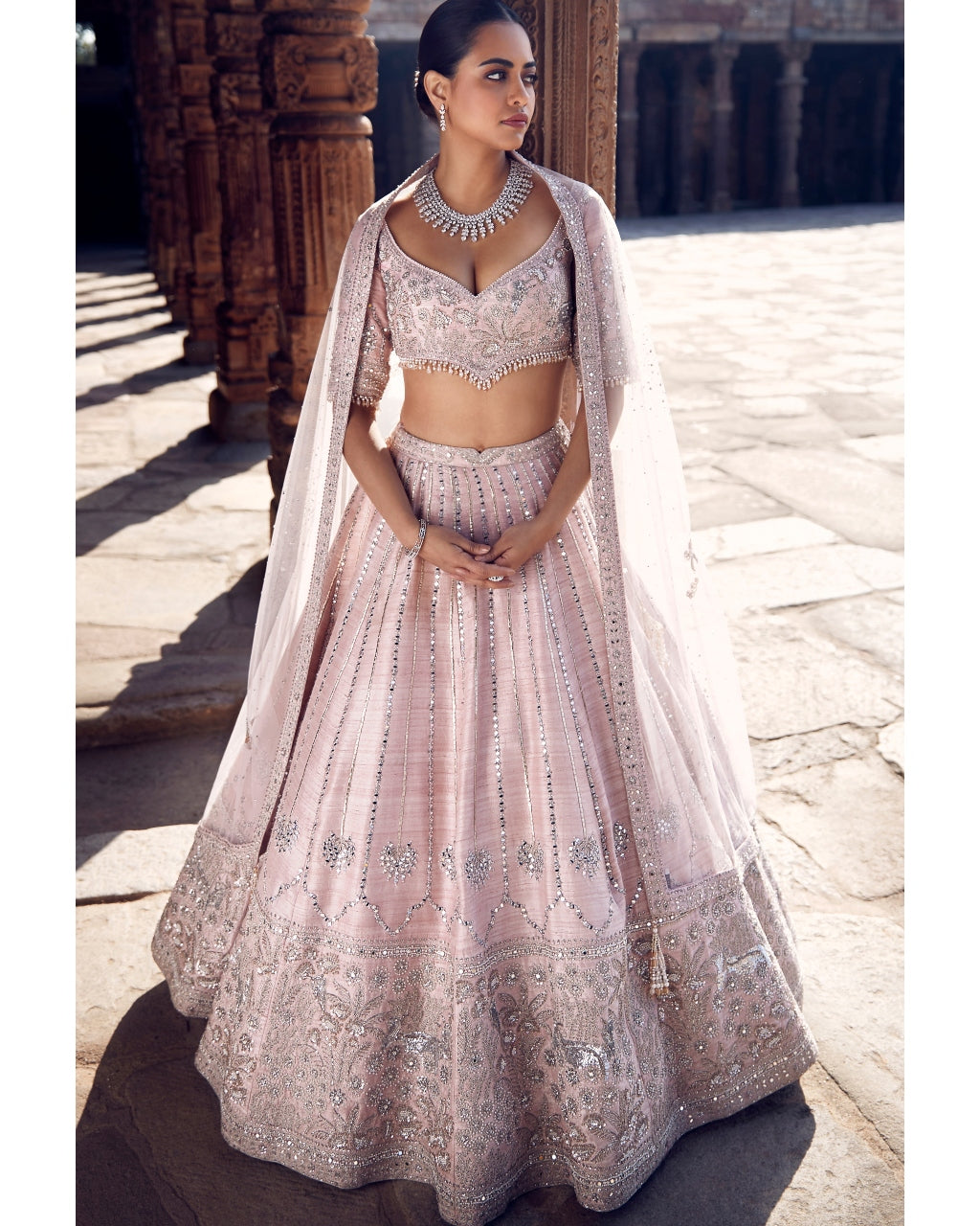 Unlock the timeless elegance of the Blush tulip sheesha gota lehenga. Its raw silk fabric boasts intricate Gota work and silver Dori embroidery for a touch of opulence. Adorned with stunning mirror details, this lehenga also features the iconic Matsya V-Wing belt for a touch of luxury.