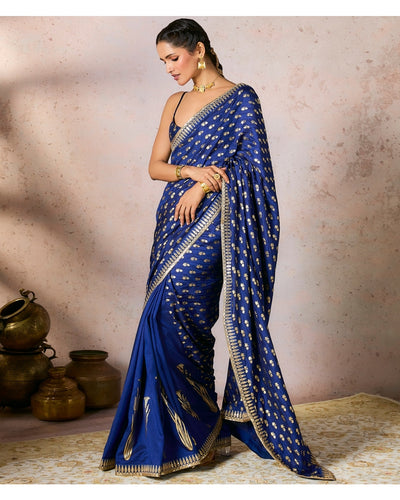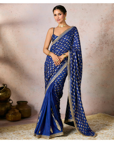 Experience the exquisite beauty of our blue whispering lily crush sari. Featuring a pixie dust print crushed palla and a stunning whispering lily foil placement, this Sari is a work of art. The embroidered borders and all-over foil print on the blouse add a touch of elegance.