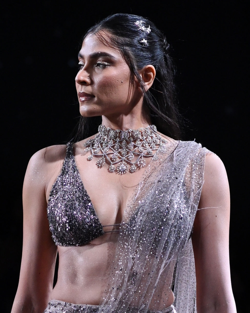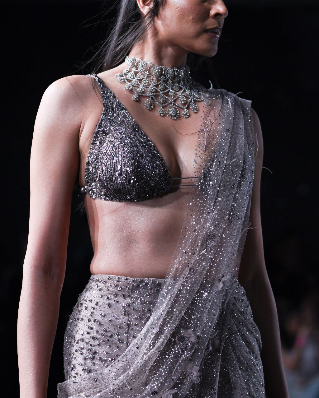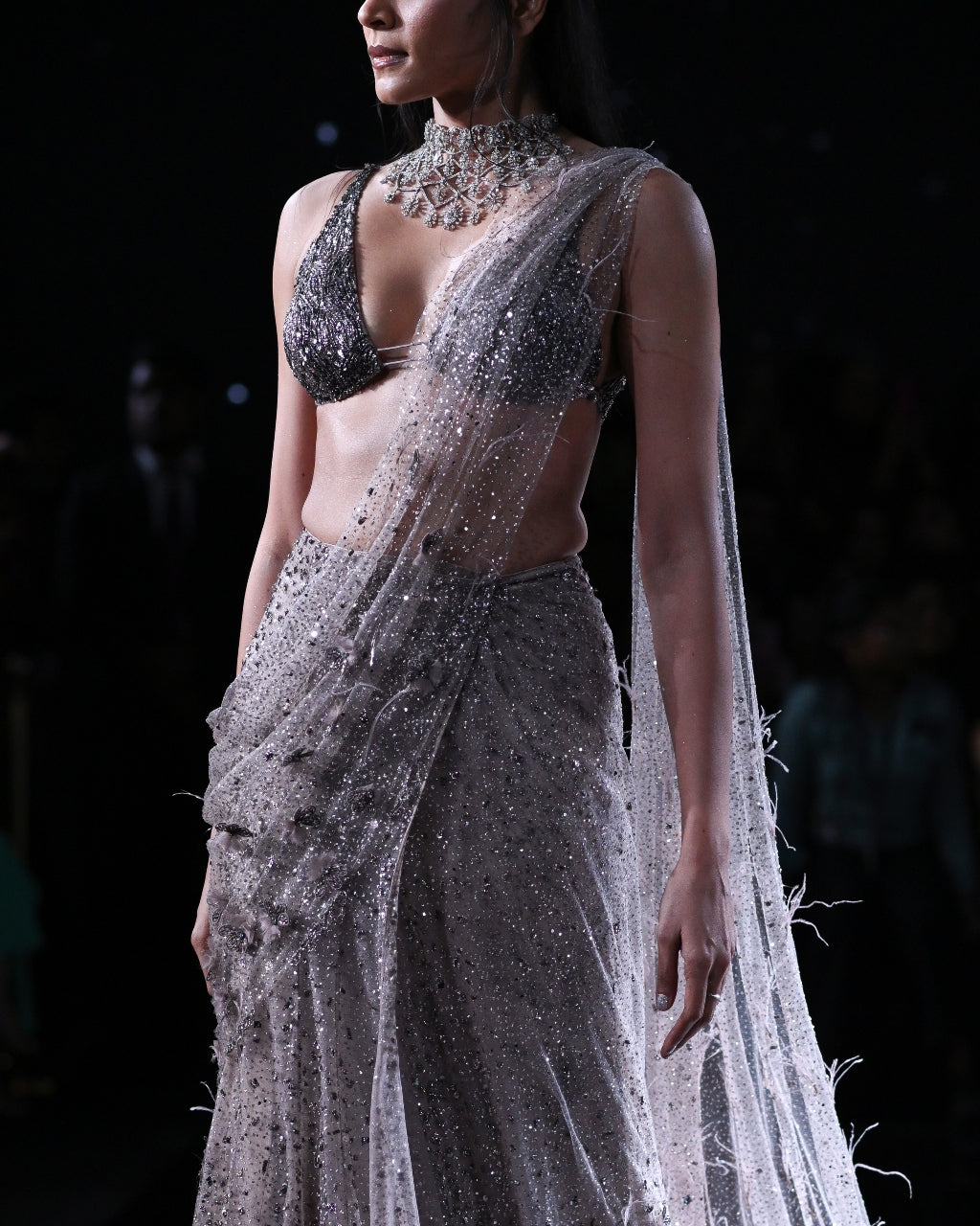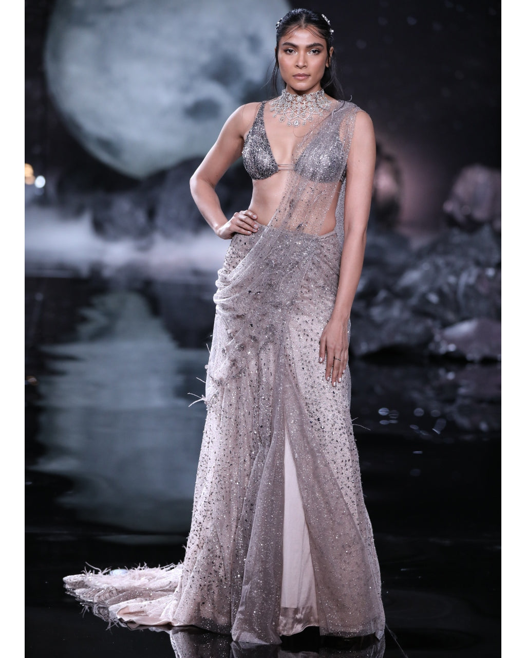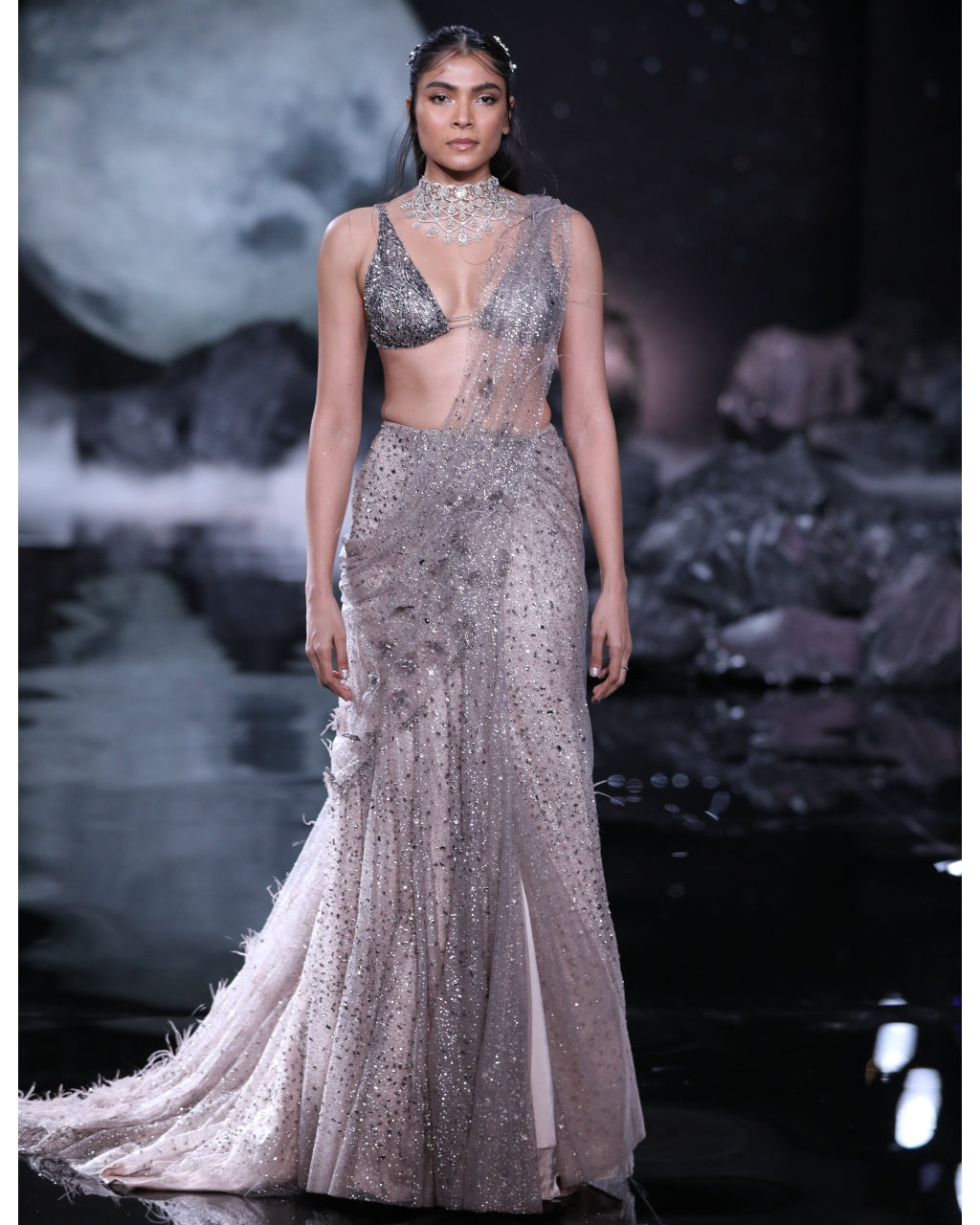 Expertly crafted for a stunning and regal look, the Eres lehenga sari set is adorned with gunmetal shimmer tulle and exquisite crystal hand embroidery. The addition of feathers and embroidered petals on the trail adds a touch of opulence to this elegant ensemble. Perfect for any special occasion.