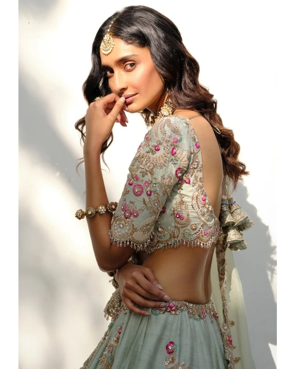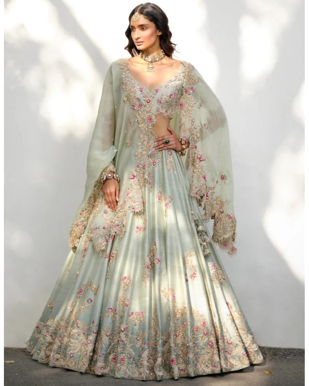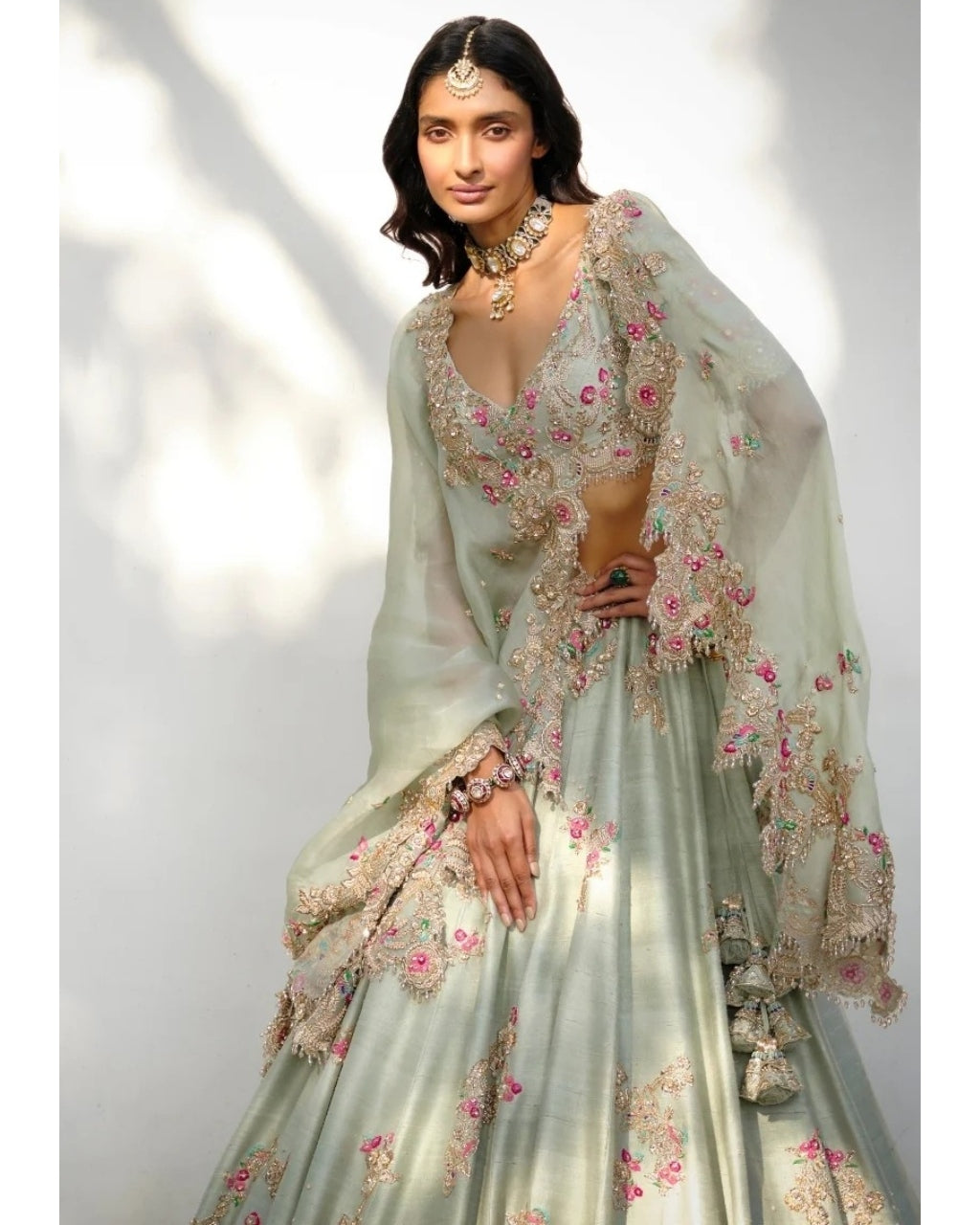 Immerse yourself in refined luxury with our Rachel raw silk lehenga set. Masterfully tailored from sumptuous sage green raw silk, this ensemble showcases meticulous embroidery and thoughtfully placed tassels that elevate its aesthetic appeal. The accompanying sage green organza dupatta completes this sophisticated creation, perfect for those who appreciate artisanal craftsmanship and timeless elegance.