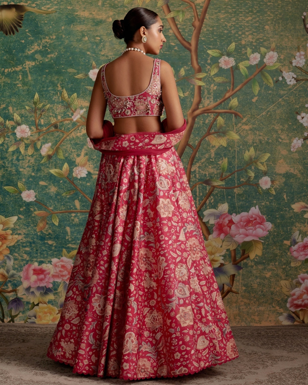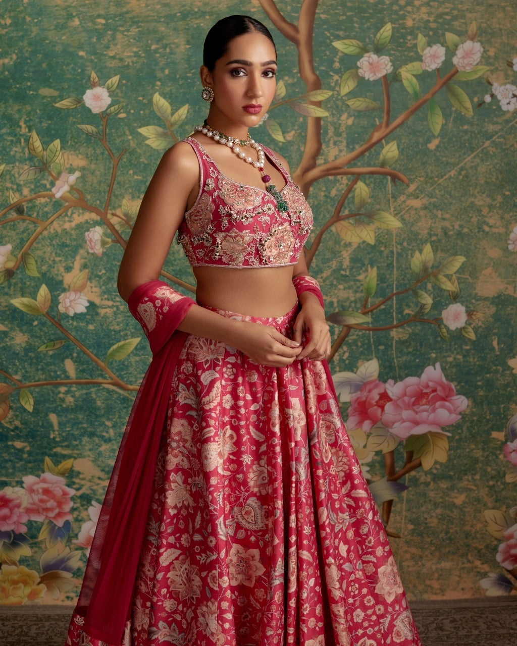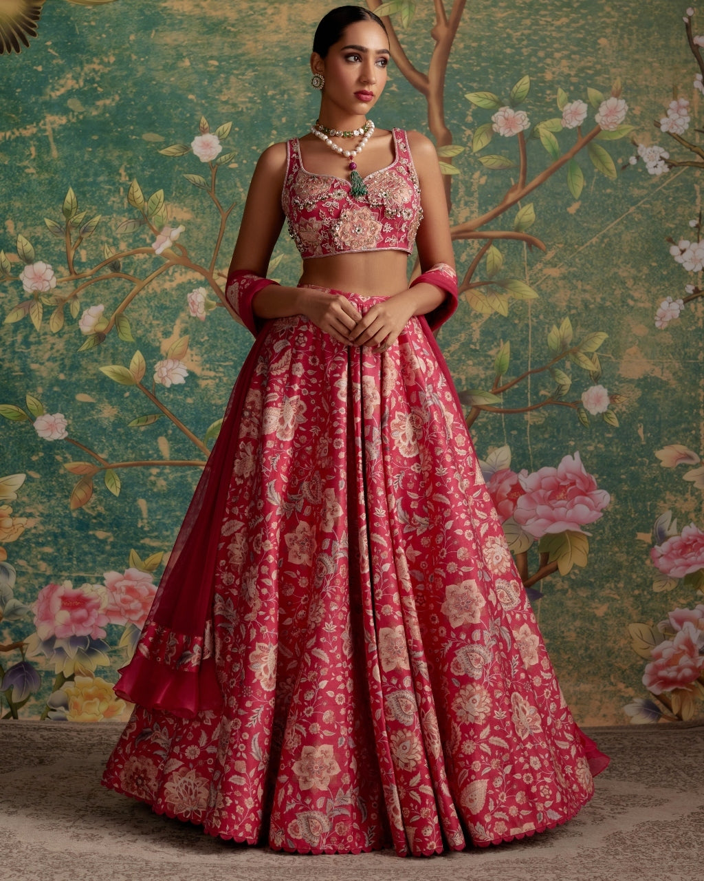 Indulge in elegance with our Royal fuchsia print demi lehenga set. This masterpiece features a net embroidered applique blouse, a printed raw silk lehenga, and a net dupatta adorned with organza ruffles. Intricate embroidery, including pearls, green stones, and detailed threadwork, adds a touch of traditional craftsmanship to the contemporary design. Perfect for special occasions, this set is a timeless and captivating addition to your ethnic wardrobe.