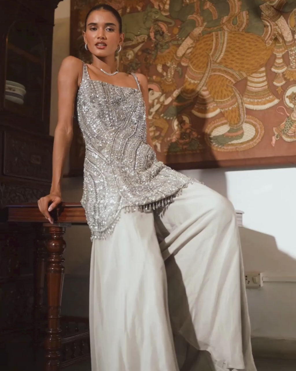 An exclusive collaboration between KYNAH and DiyaRajvvir, the Aavya Palazzo Set is a striking blend of elegance and modern glamour. Crafted in a rich gray hue, the strapless kurta top features full embroidery, sparkling beads, and a delicate scalloped hem. Paired with flowing organza palazzo pants, this ensemble offers a refined silhouette with effortless movement. Perfect for a Sangeet, reception, or any festive celebration that calls for a standout, sophisticated look.