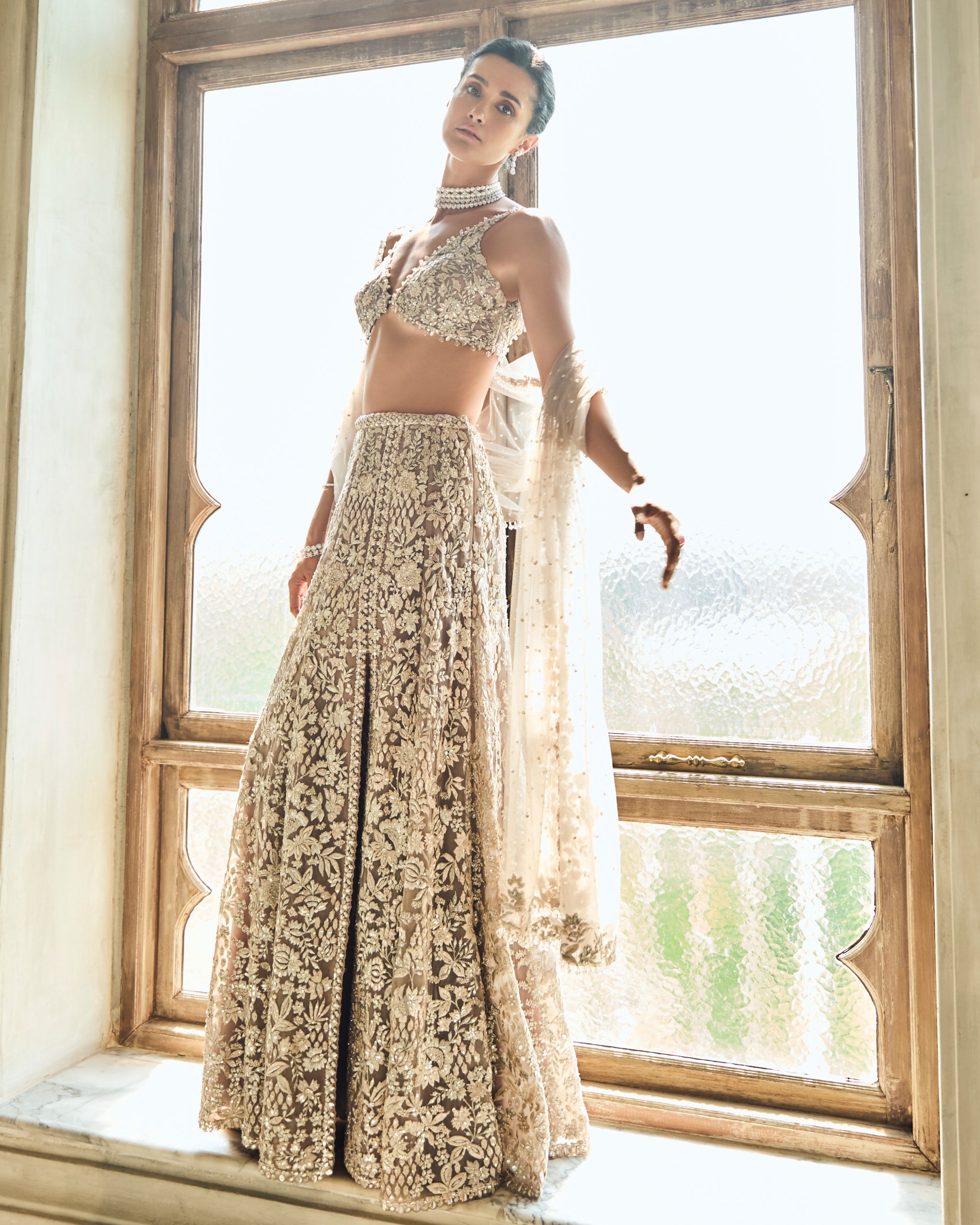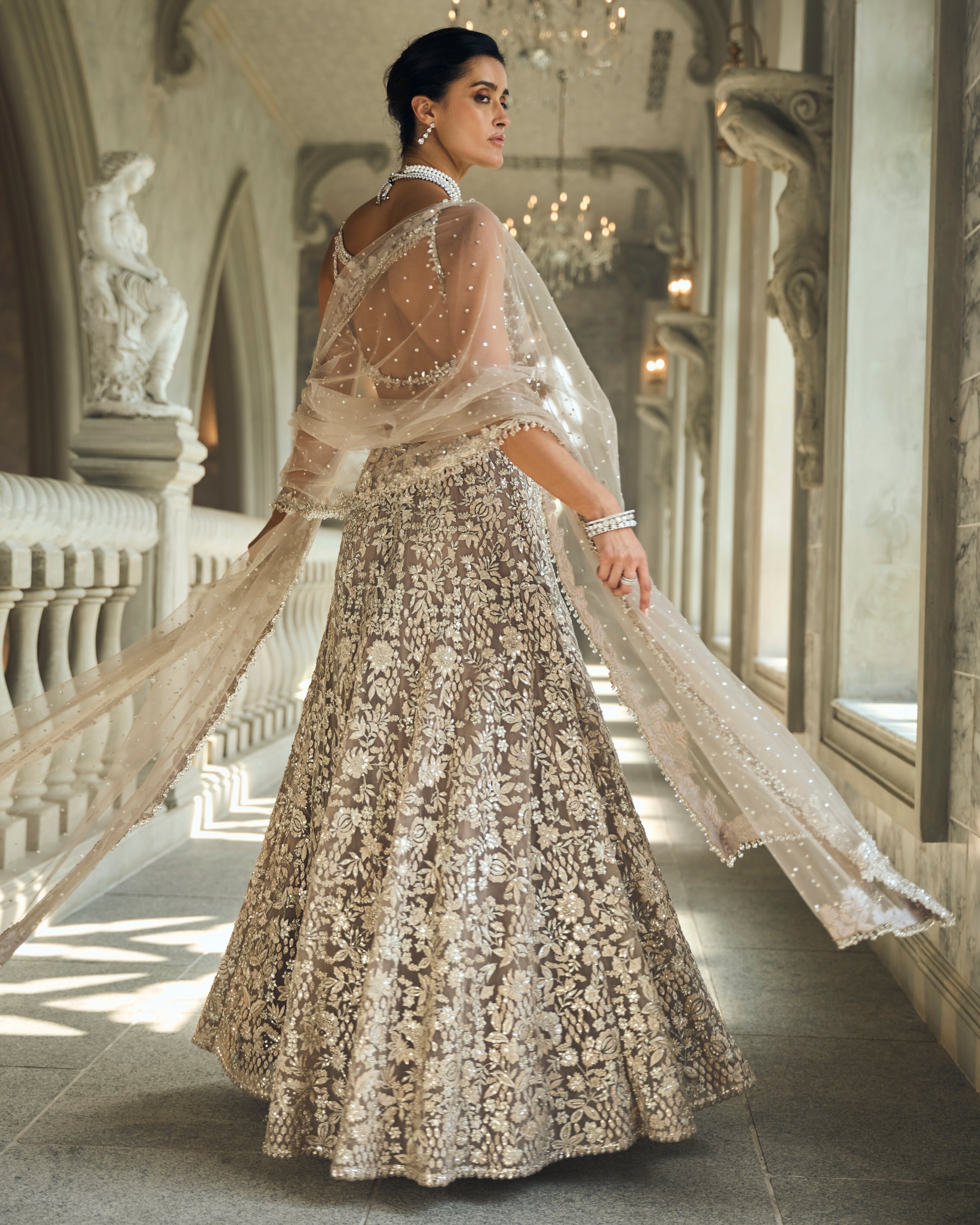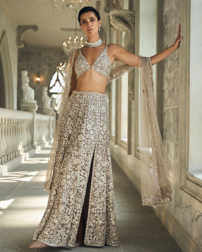 Elevate your style with our Chapelle ash grey & silver skirt set. This set features exquisite silver and thread embroidery embellished with crystals, beads, and sequins for a dazzling look. The high slit in the skirt adds a touch of sensuality while the plunging neckline and tassels on the blouse bring an element of elegance. Complete the look with the four-sided embroidered net dupatta.