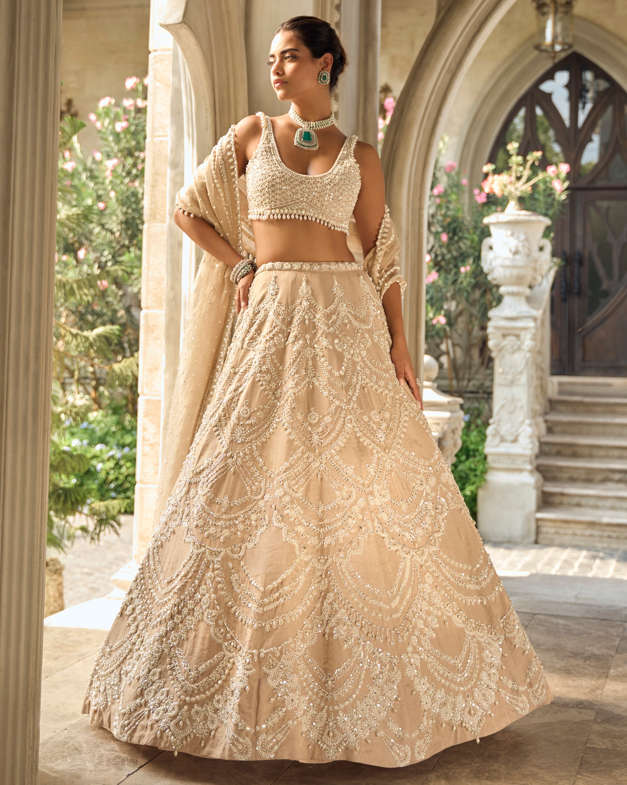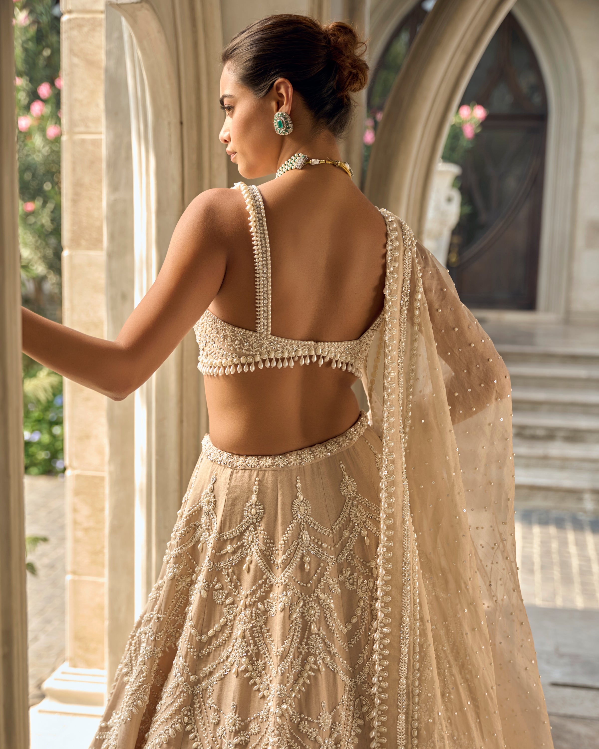 Expertly crafted from nude tissue silk, the Chapelle lehenga set features intricate chandelier inspired pearl and sequin embroidery for a luxurious touch. The matching blouse boasts pearl drops at the waist while the tissue organza dupatta exudes elegance with its embroidered border and delicate pearl detailing.