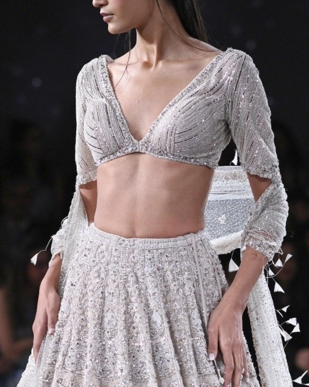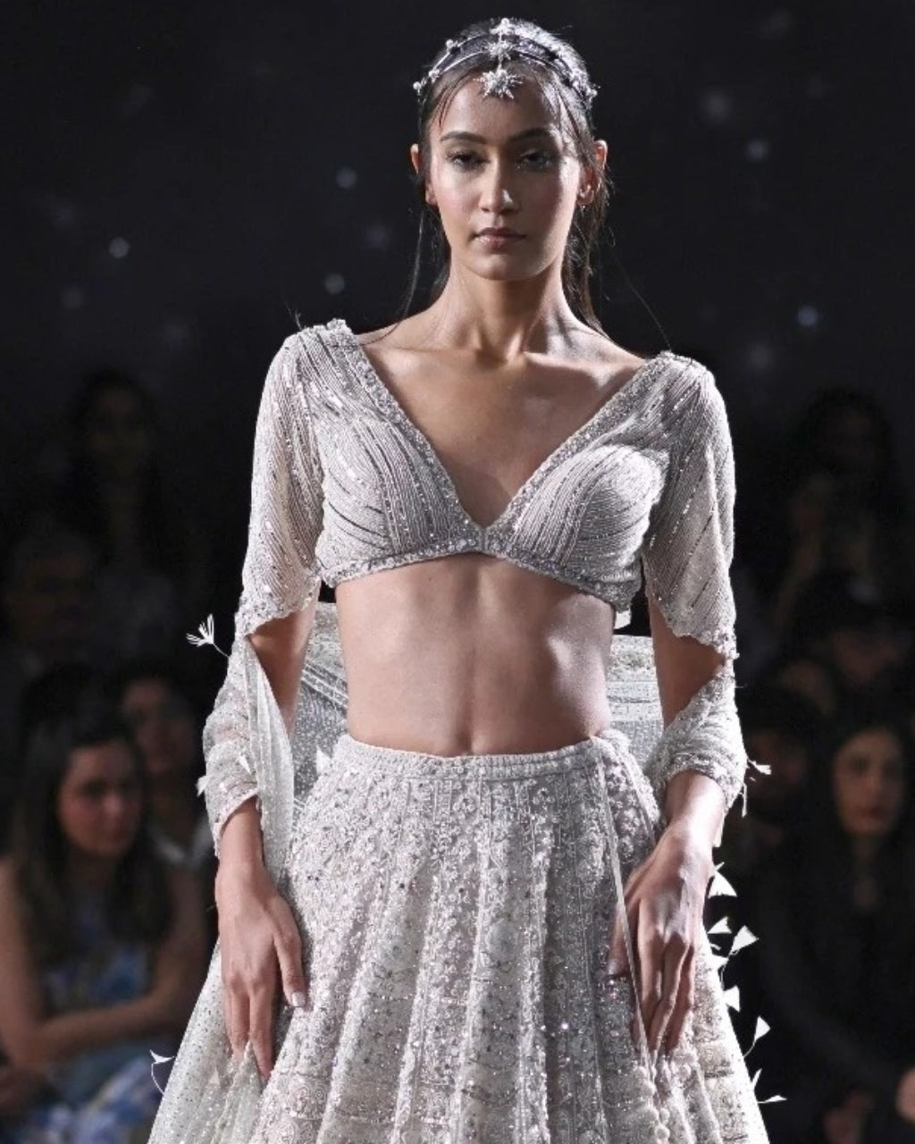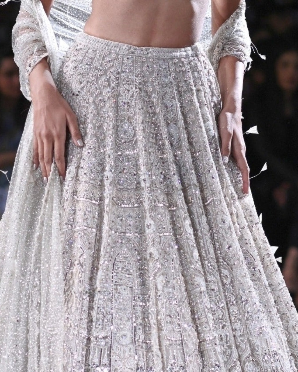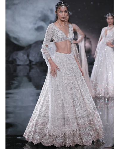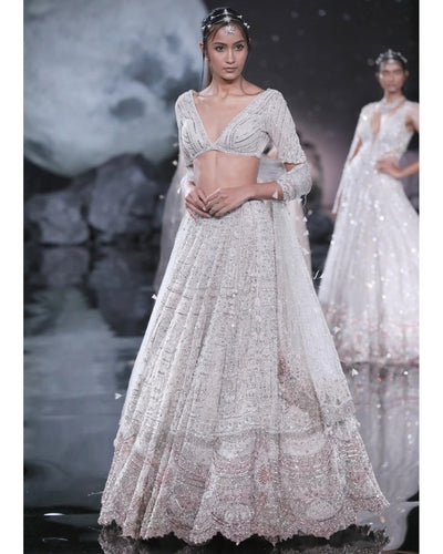 This stunning Larisa bridal lehenga set features a beautiful dusty ivory shimmer tulle lehenga adorned with delicate pearl and crystal embroidery, finished with a silver and pink crystal border. The set also includes a pearl and mukaish choli top and embroidered shimmer Tulle dupatta, making it the perfect choice for a traditional and elegant look. Elevate your bridal ensemble with this effortlessly luxurious set.