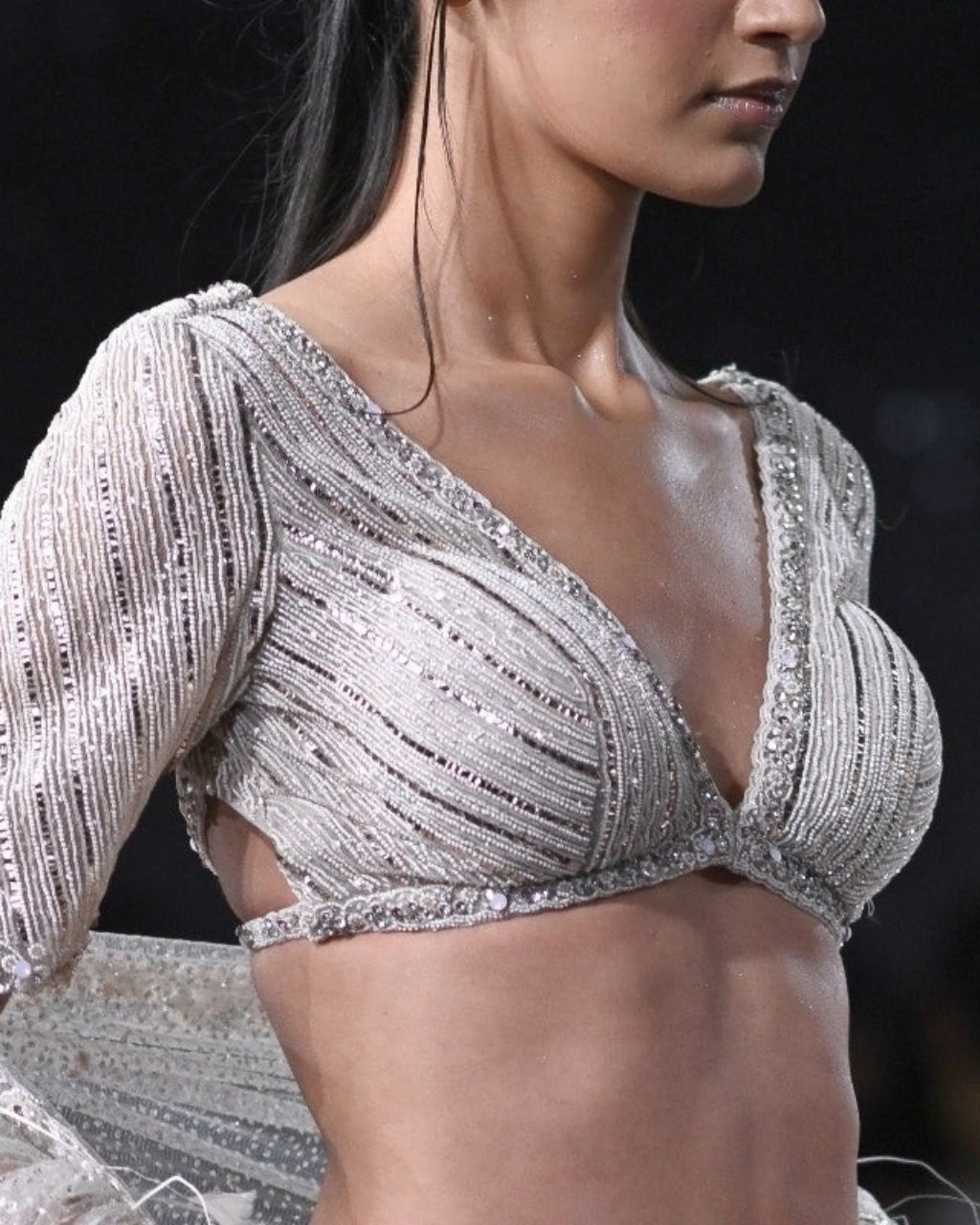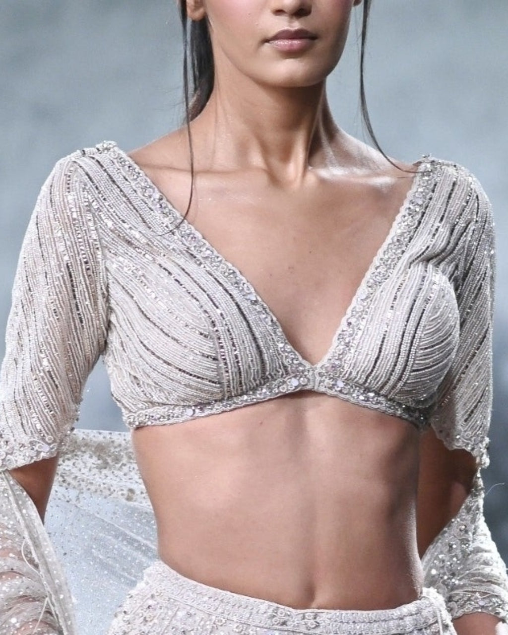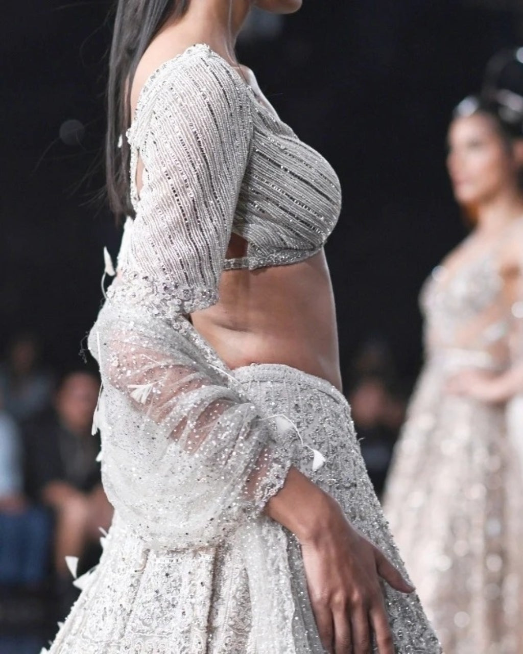 This stunning Larisa bridal lehenga set features a beautiful dusty ivory shimmer tulle lehenga adorned with delicate pearl and crystal embroidery, finished with a silver and pink crystal border. The set also includes a pearl and mukaish choli top and embroidered shimmer Tulle dupatta, making it the perfect choice for a traditional and elegant look. Elevate your bridal ensemble with this effortlessly luxurious set.