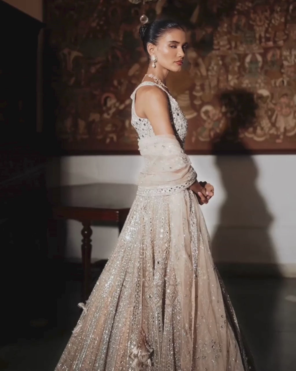 The KYNAH exclusive Nooria Lehenga showcases intricate all-over mirror and silver zari embroidery on a net base, creating a stunning, light-reflective finish. It’s paired with a fully embroidered, corset-style blouse crafted from raw silk and complemented by a matching net dupatta adorned with tassel detailing along the borders. A perfect choice for a statement-making KYNAH bride.