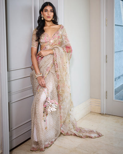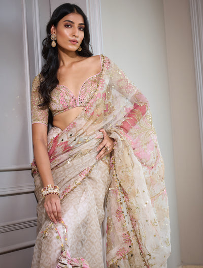 Elevate your style with the shazana sari set. This exquisite set includes a pre draped hand embroidered saree and a complementary blouse, perfect for any formal occasion. Embrace the luxury and exclusivity of this sari set, showcasing intricate details and elegant design. Make a statement and exude sophistication with the shazana sari set.