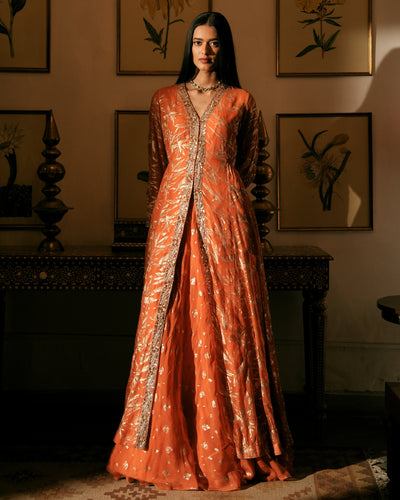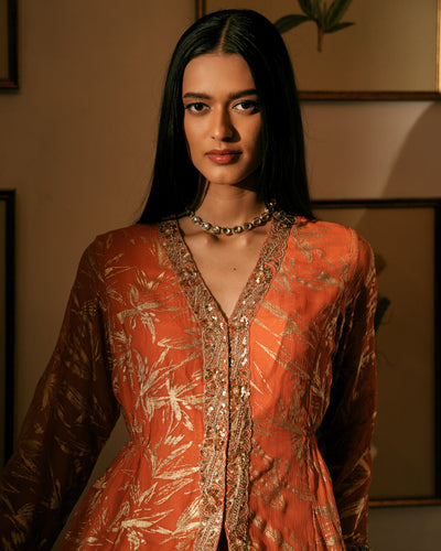 The Sona Jacket & Skirt Set features a full-sleeve jacket crafted from luxurious chiffon with beautiful foil prints and is paired with a matching organza skirt. The lightweight, flowing fabric adds grace, while delicate embroidery along the jacket’s edge adds a touch of sophistication—ideal for special occasions and events.