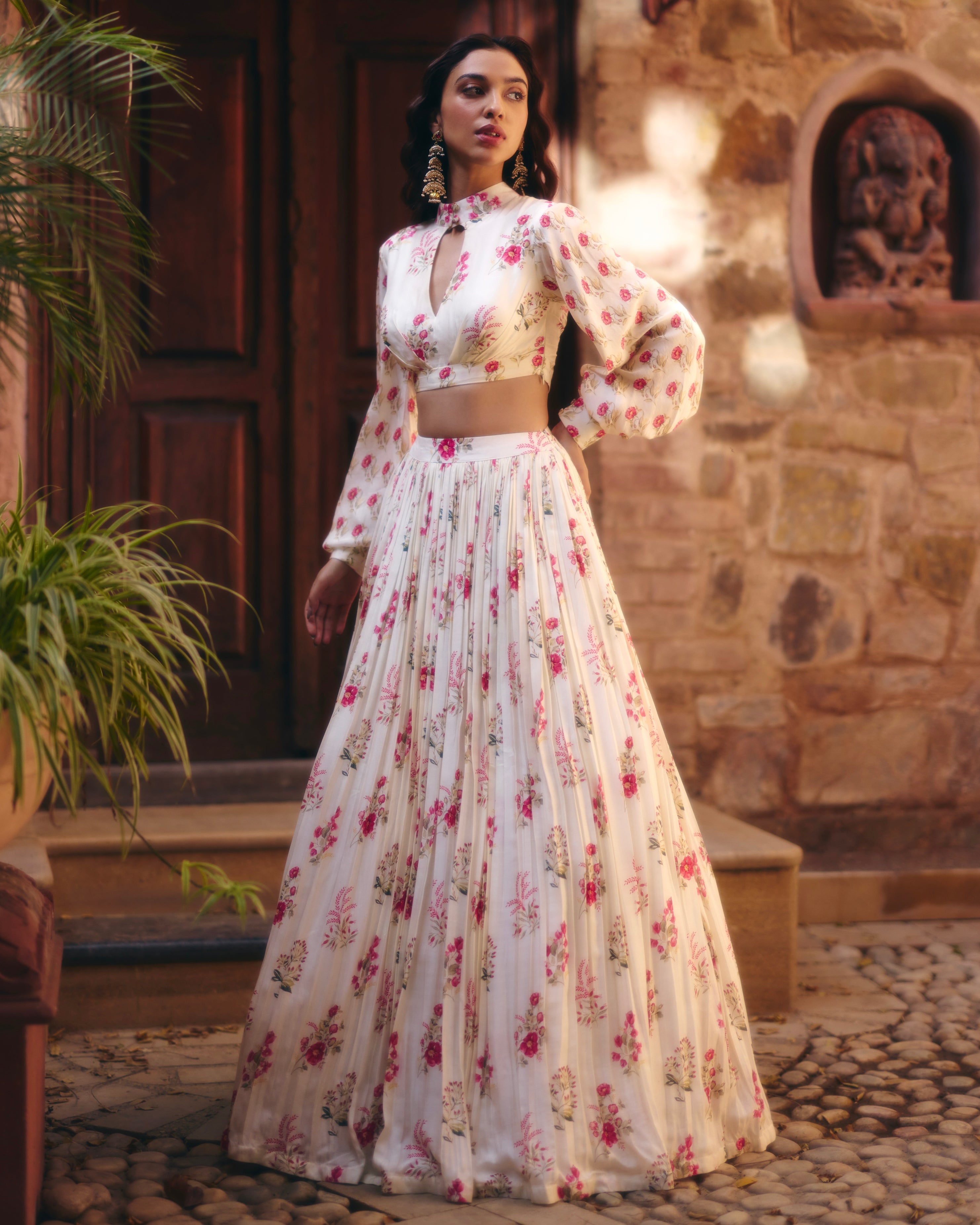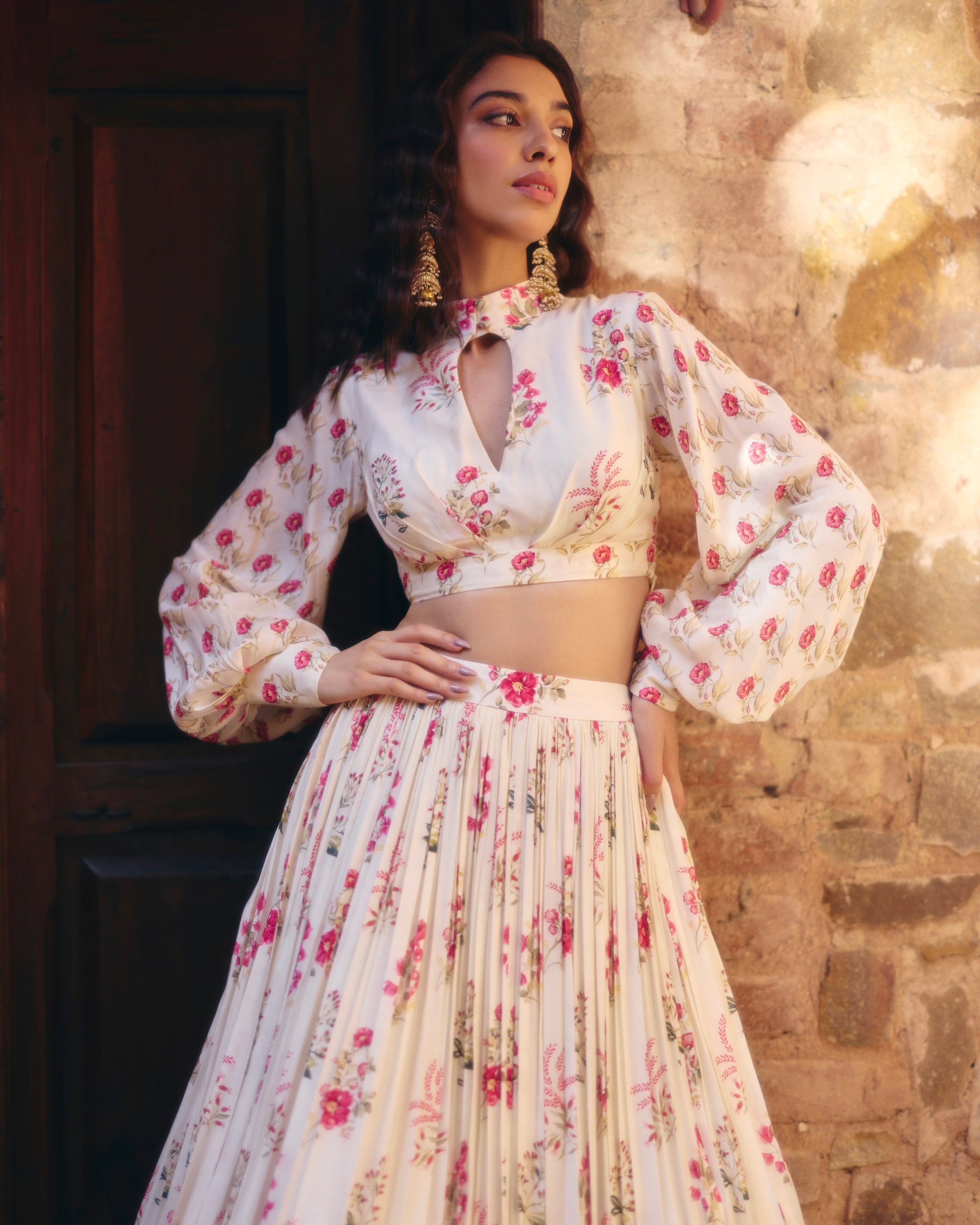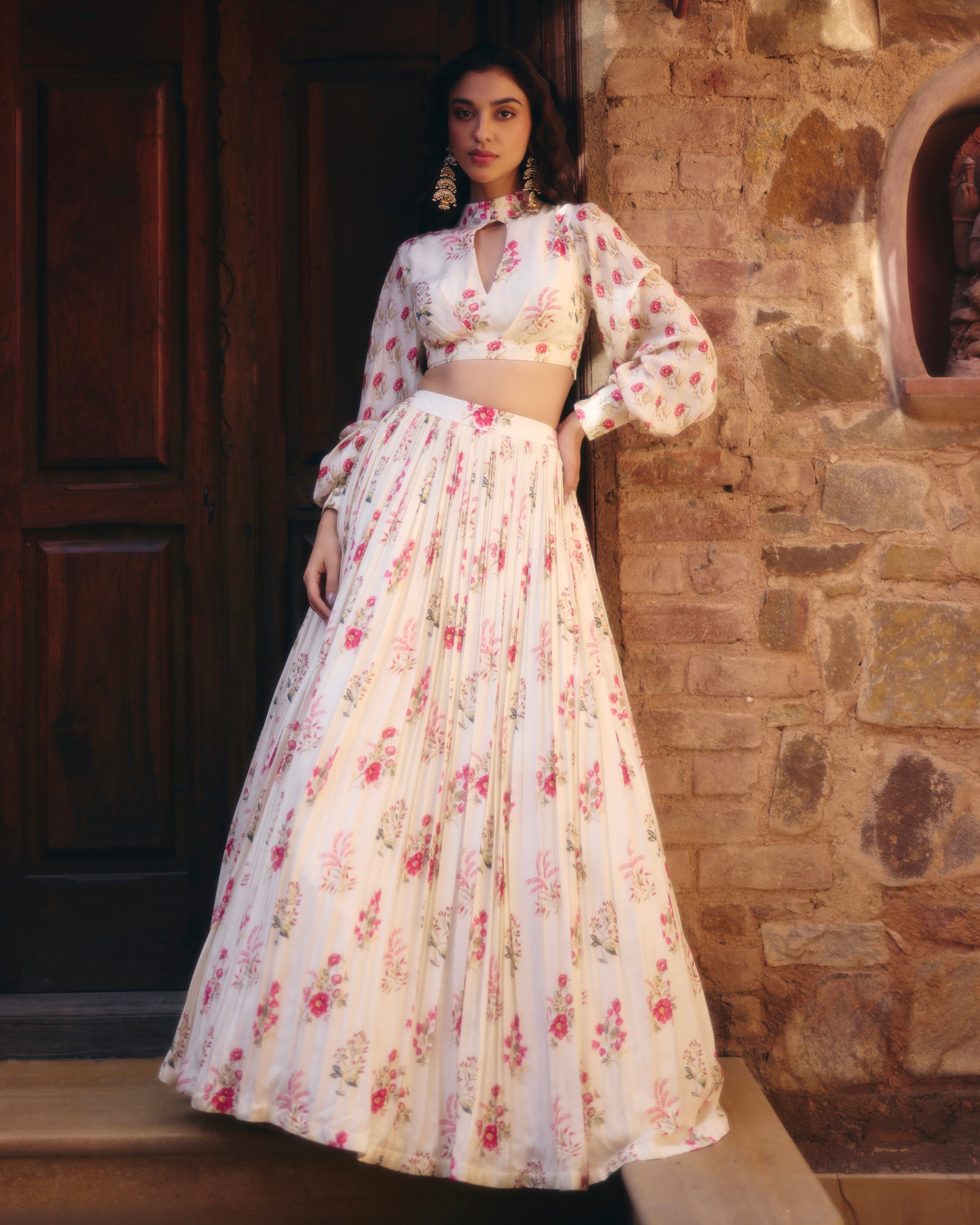Experience the ultimate summer dream while wearing our offwhite and pink floral printed full sleeves crop top paired with a floral printed gathering skirt. The perfect blend of comfort and style, this set will keep you cool and chic all season long. Upgrade your summer wardrobe with this must-have ensemble.