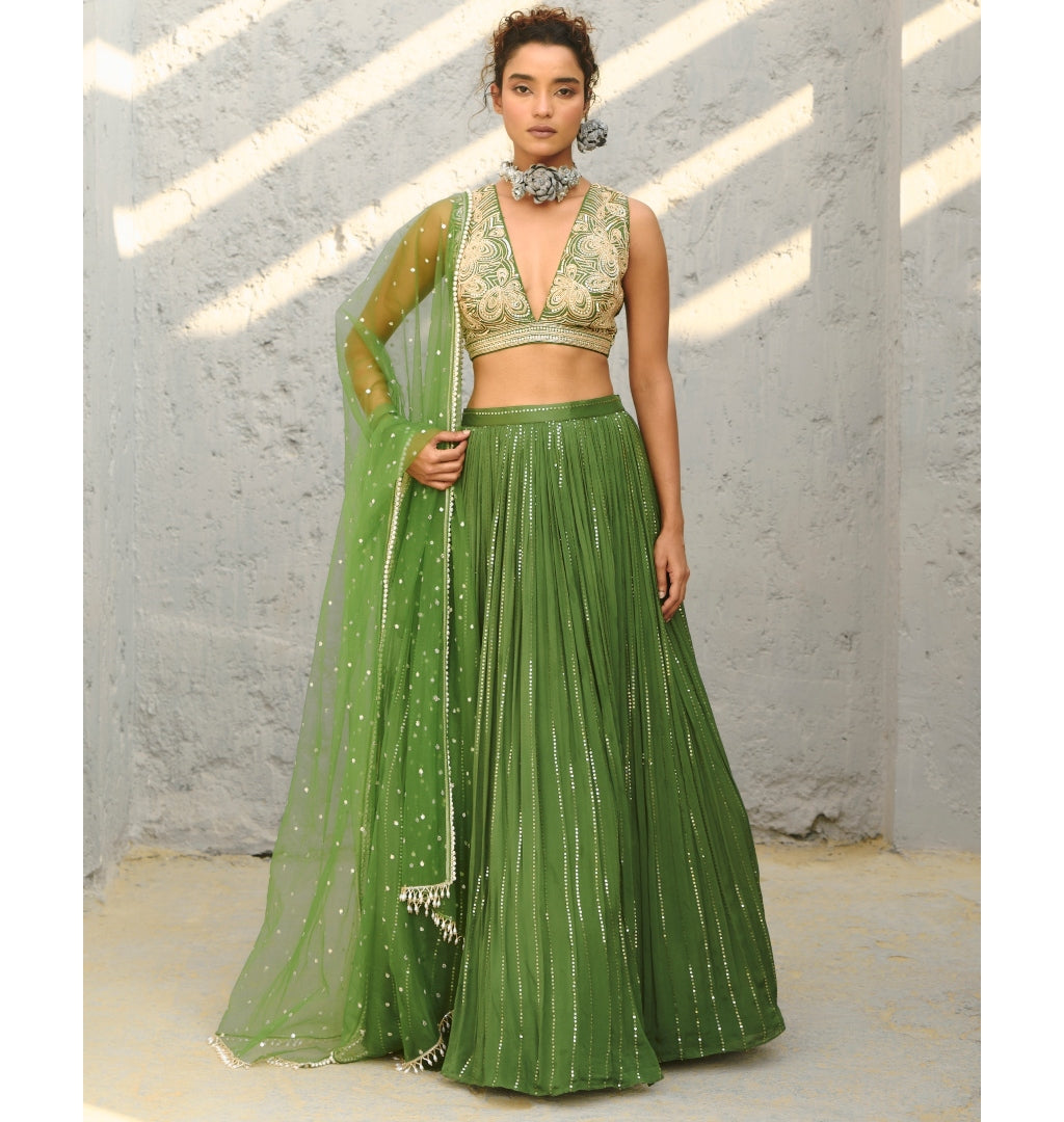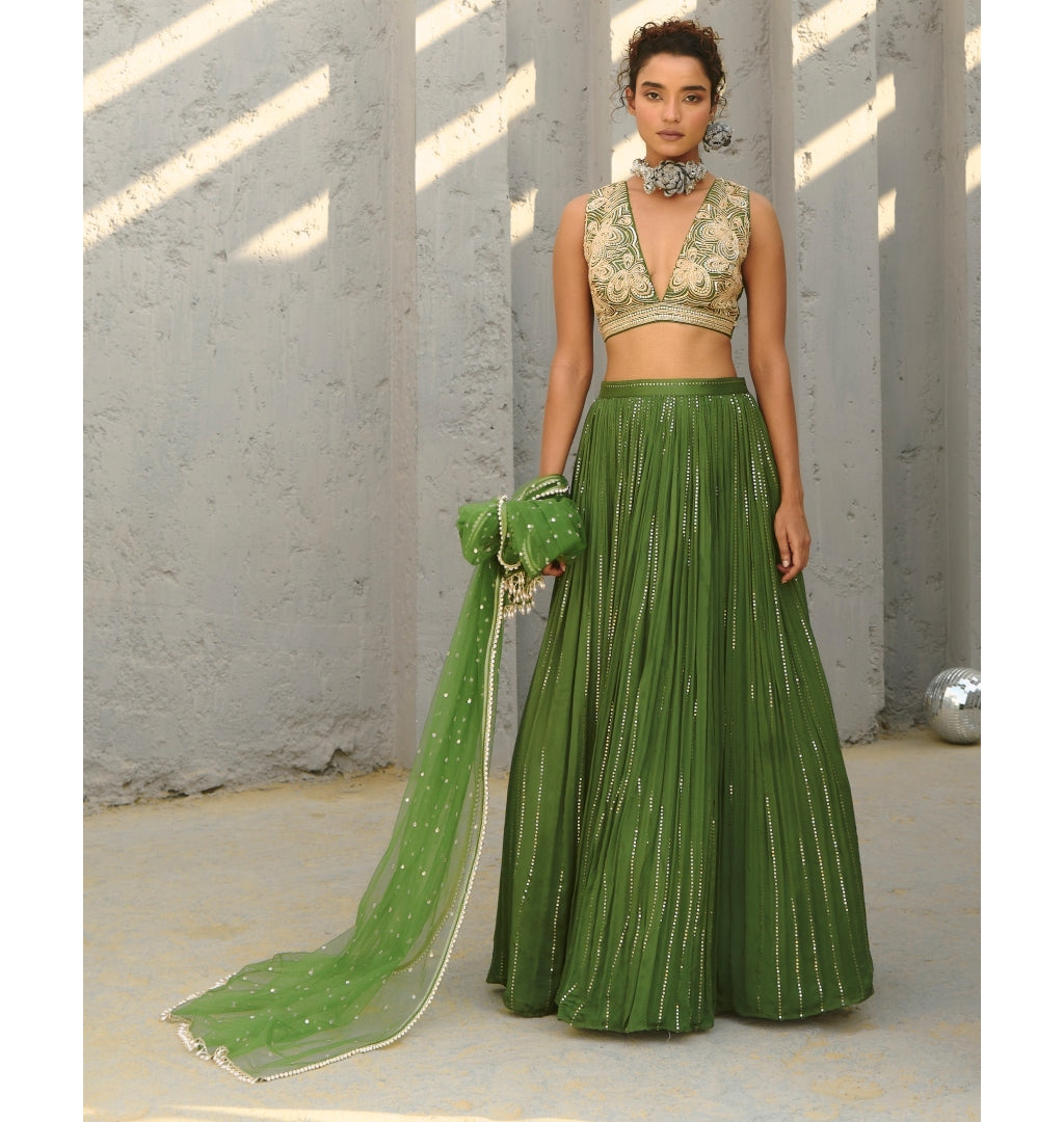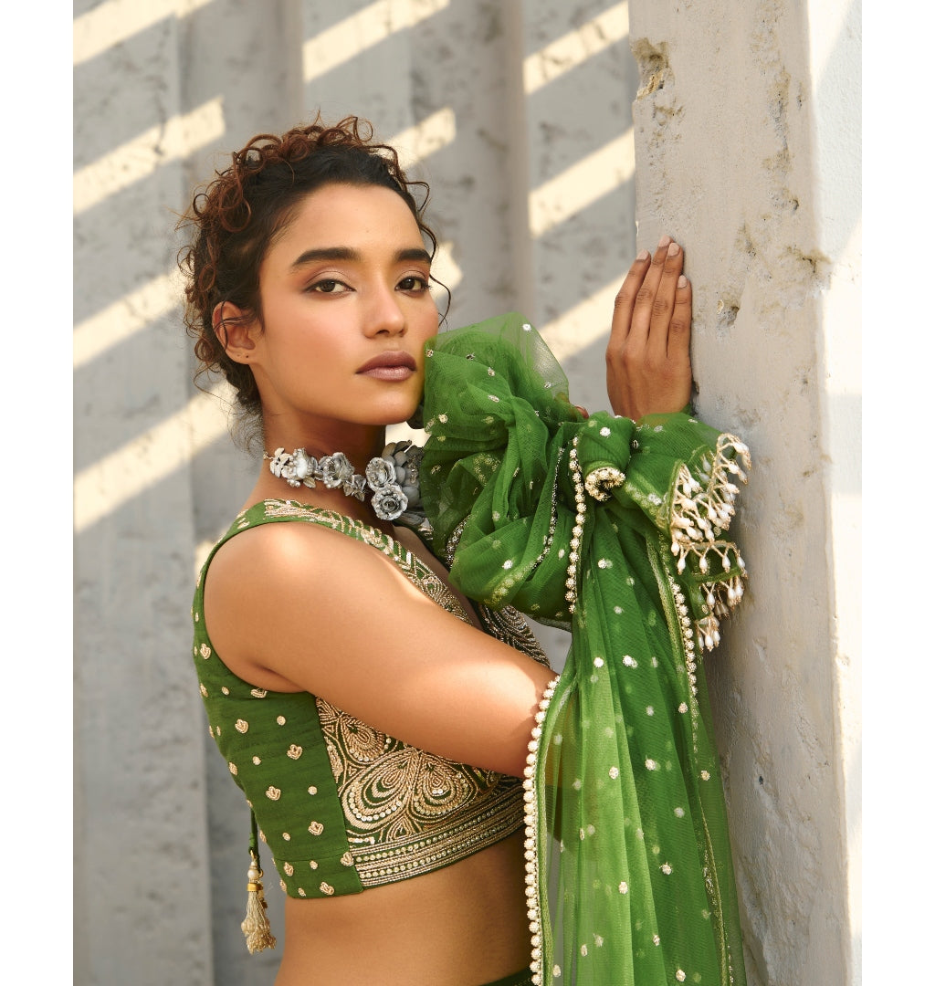 Indulge in luxury with the Venus ruched skirt set. The basil green sequence embroidered rushing skirt is paired with a deep v-neck blouse embellished with glass beads and sequence for a stunning look. Complete the ensemble with the soft tulle dupatta for a touch of elegance.