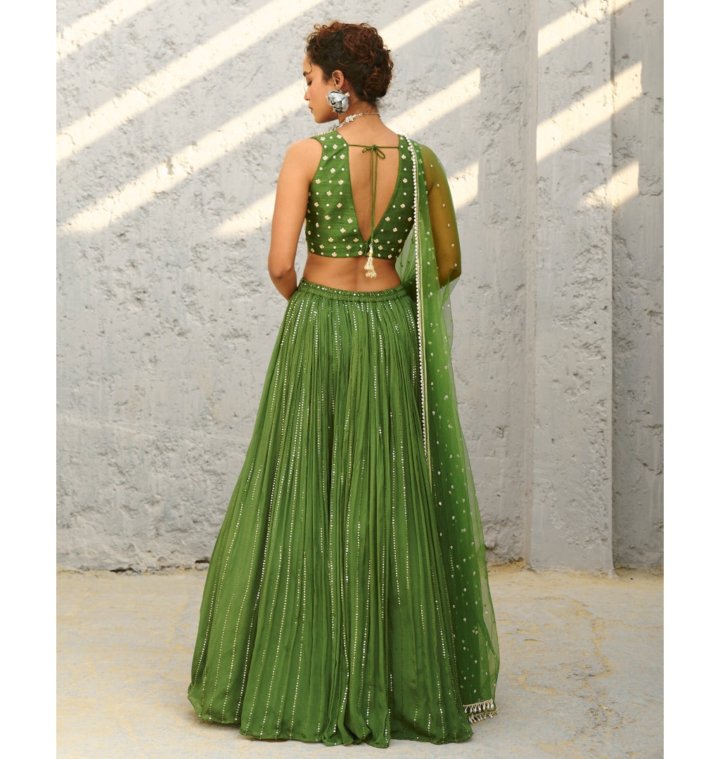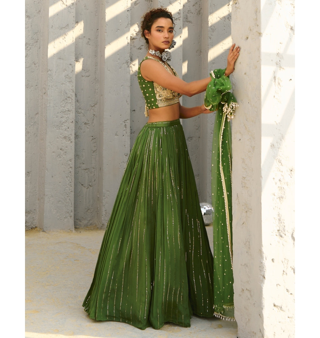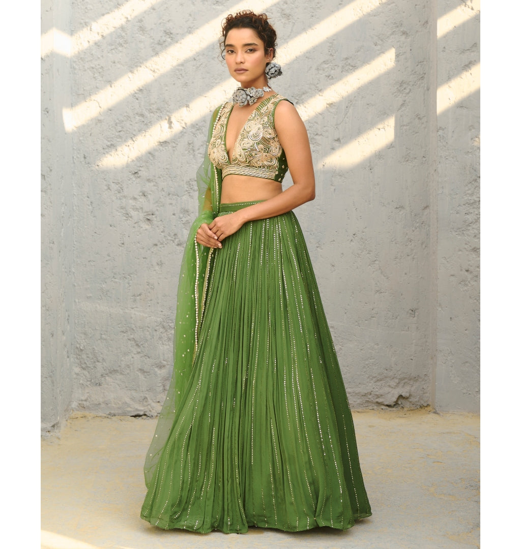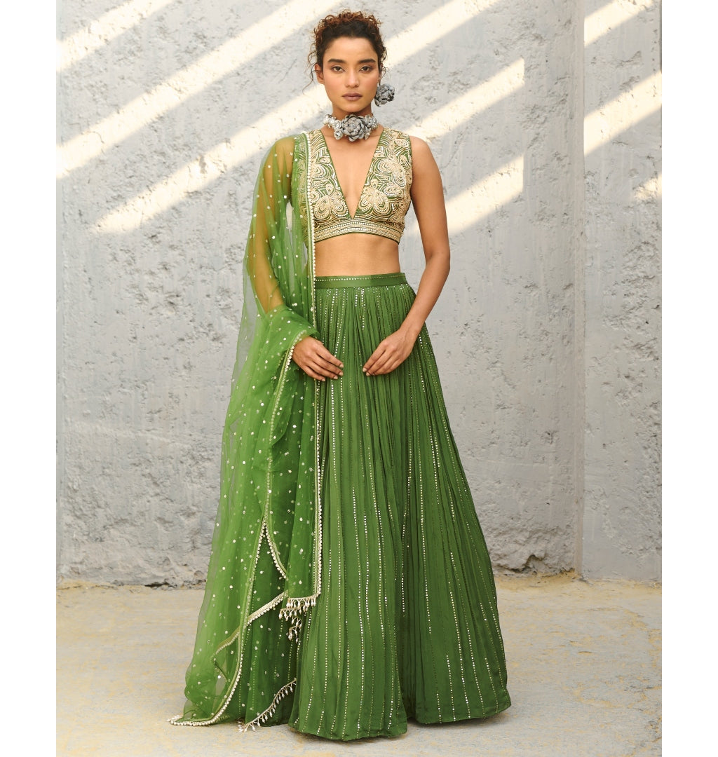 Indulge in luxury with the Venus ruched skirt set. The basil green sequence embroidered rushing skirt is paired with a deep v-neck blouse embellished with glass beads and sequence for a stunning look. Complete the ensemble with the soft tulle dupatta for a touch of elegance.