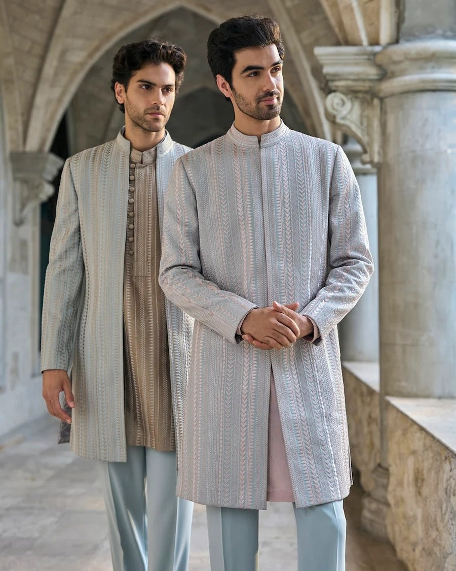 Ivory & Powder Blue Maze Open Bandhgala Set Ready to Ship