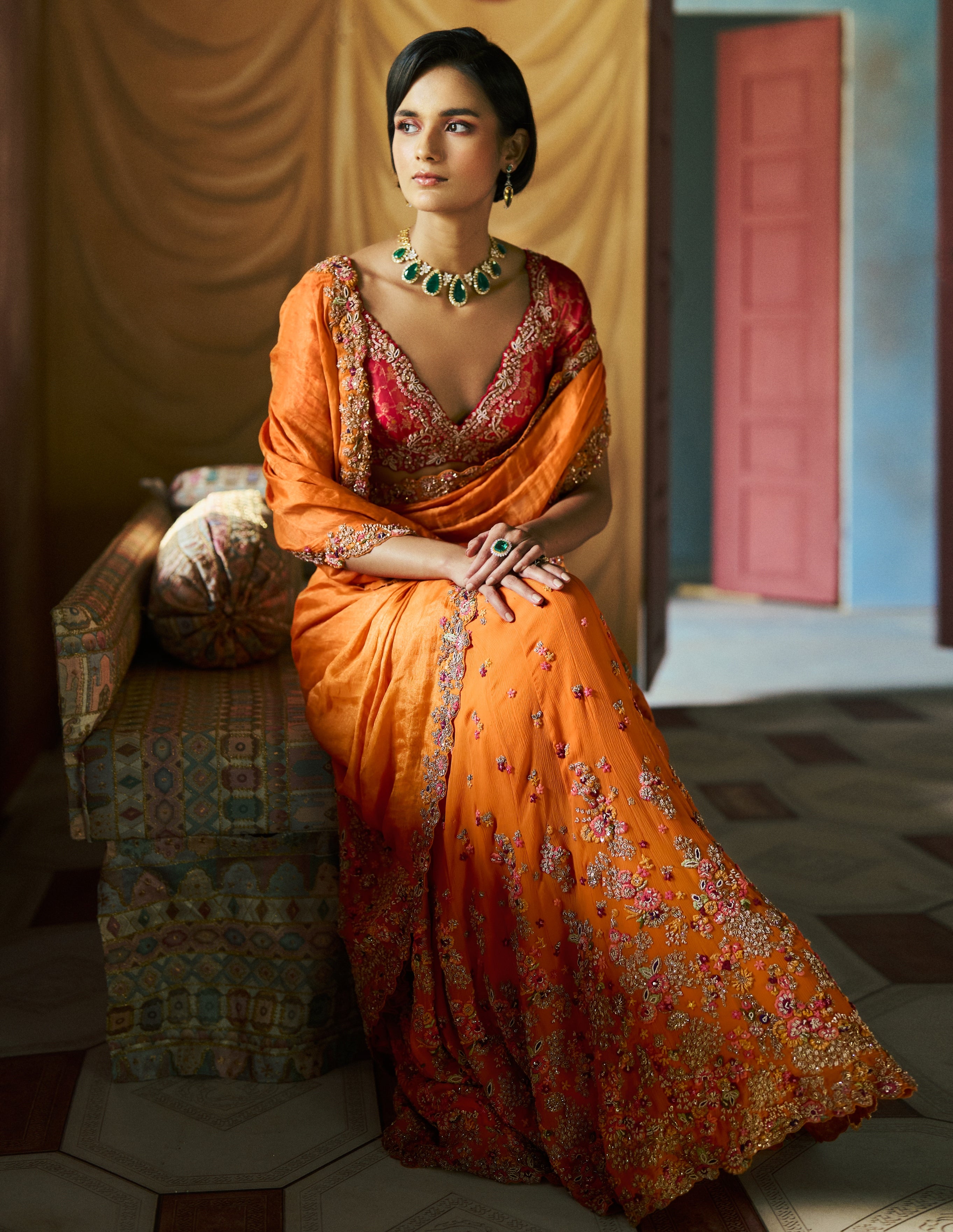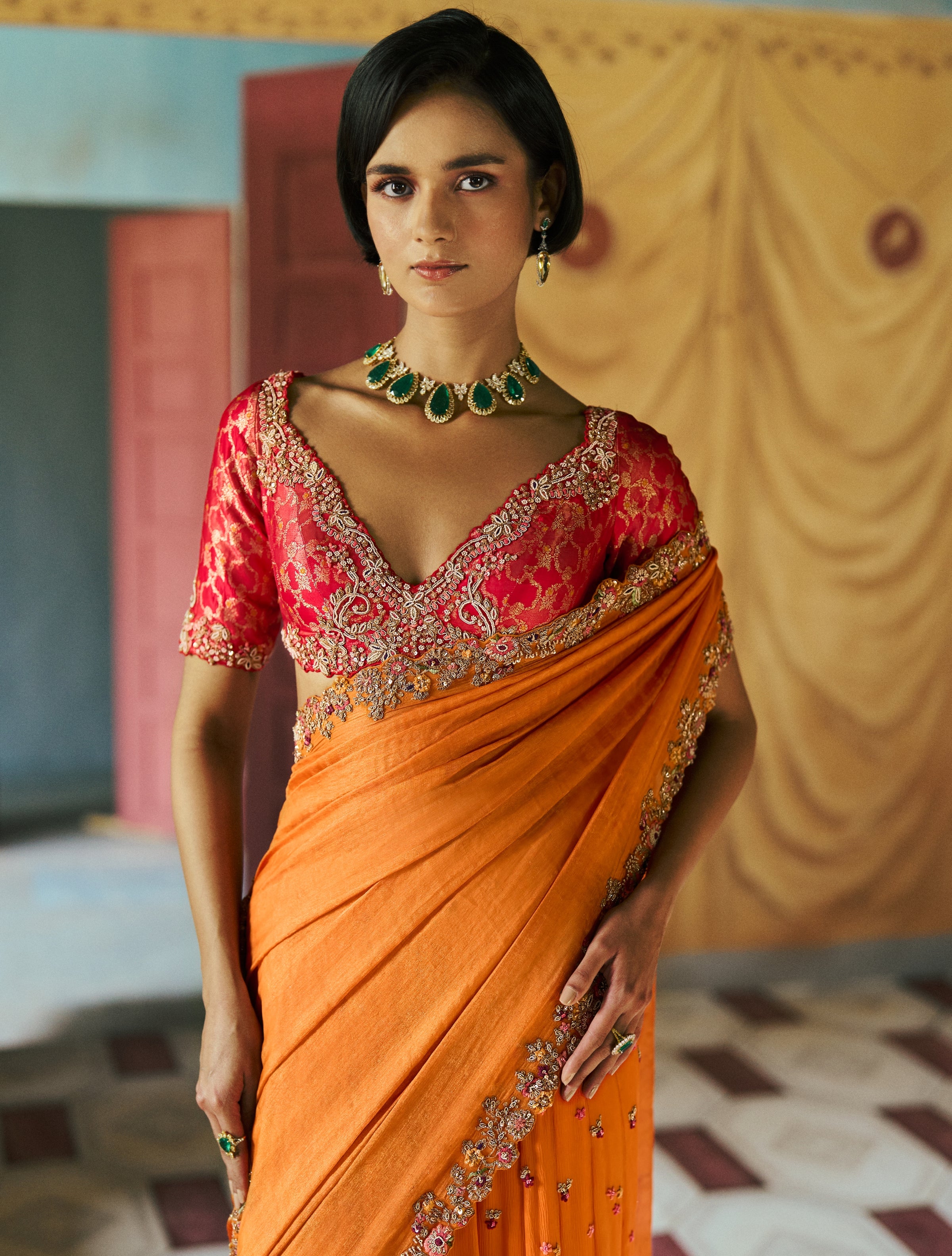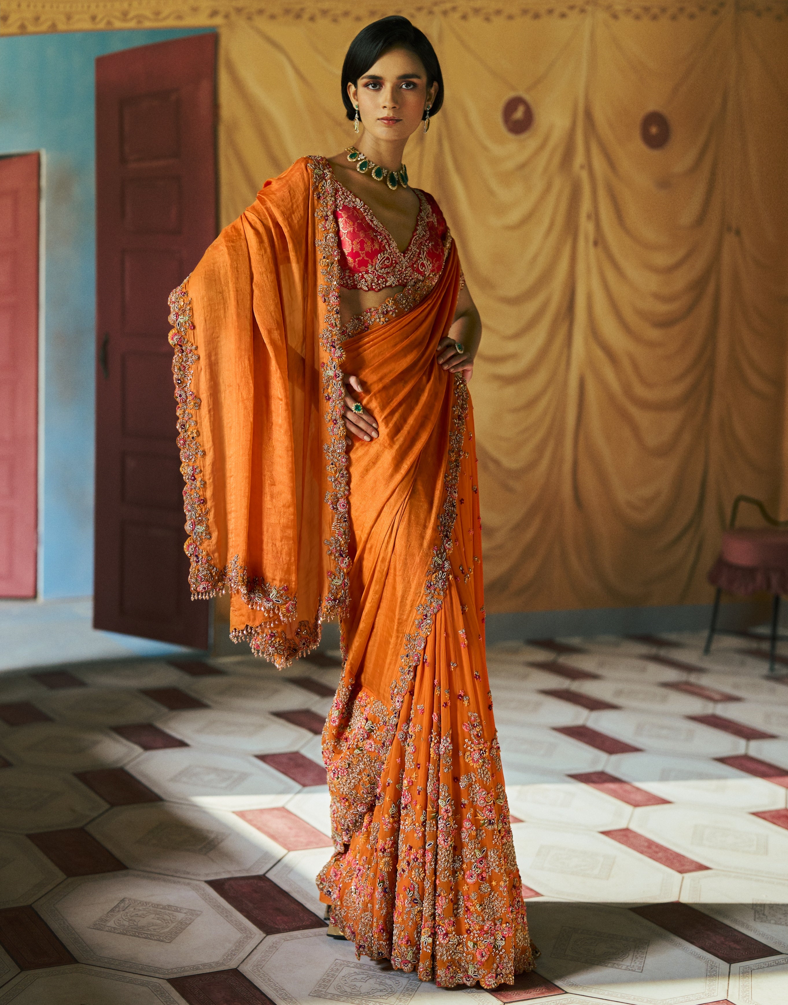 Sophisticated and timeless, the Amberika sari set is a beautiful fusion of textures. The gleaming tissue aanchal, airy chiffon kalidaar panels, and antique gold threadwork on the brocade blouse create a poetic harmony. Elevate your style with this elegant ensemble.