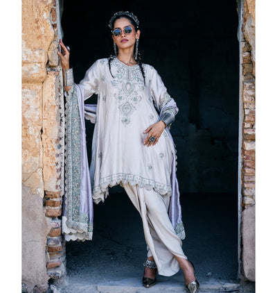 Indulge in luxury and sophistication with our Anandika beige embroidered tunic set. The beautiful embroidered tunic, paired with a dupatta and dhoti, exudes elegance and exclusivity. Perfect for any occasion, this set is a true work of art that will elevate your style to new heights.