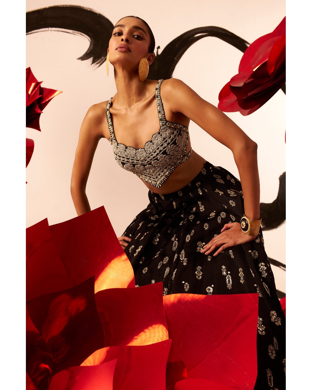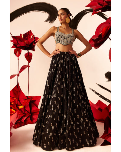 This Black floret lehenga set is perfect for those special occasions. Featuring a black floret print skirt paired with a geometric embroidery blouse, this set is both stylish and sophisticated. The intricate detailing and high-quality fabric make it a luxurious choice for an unforgettable look.