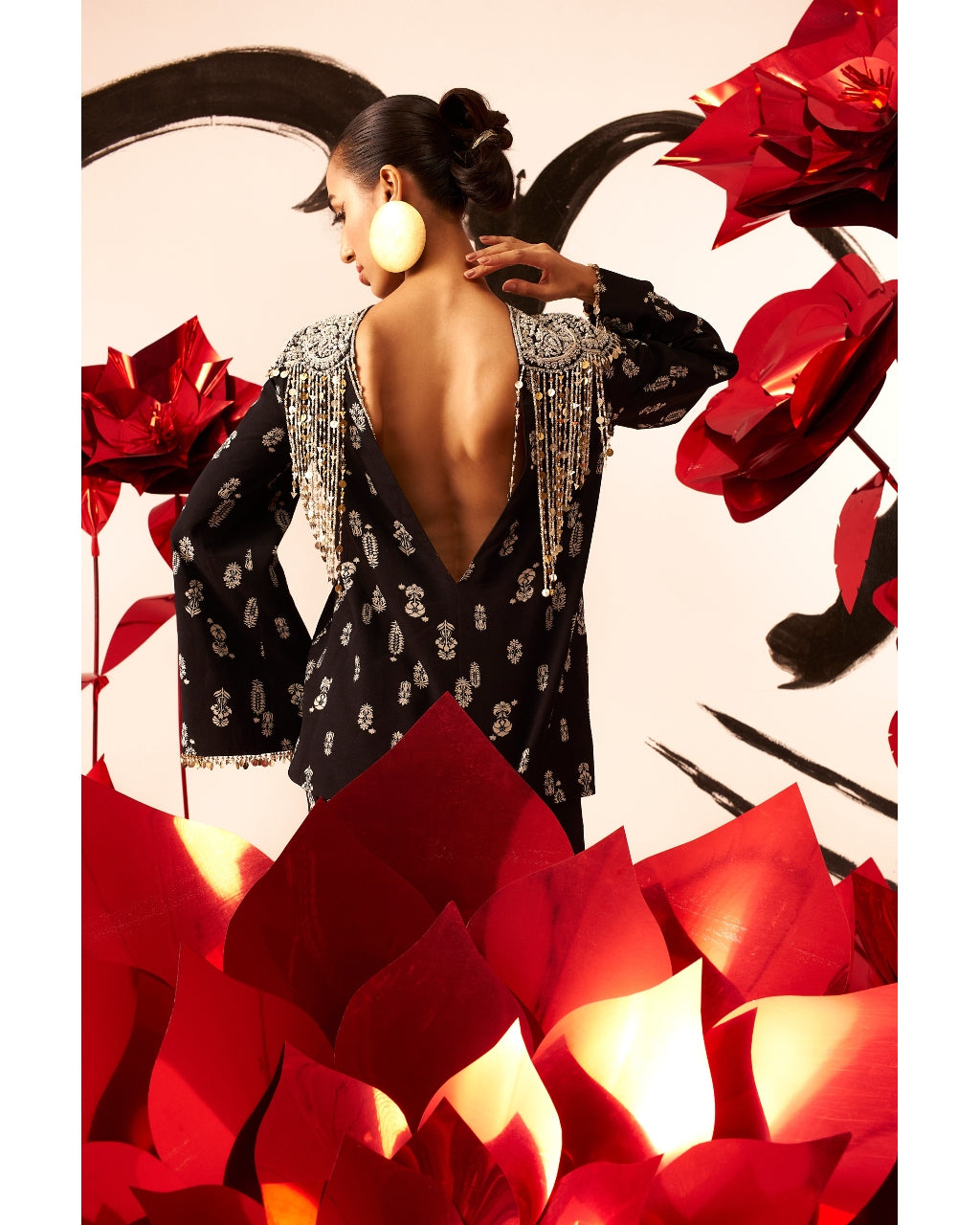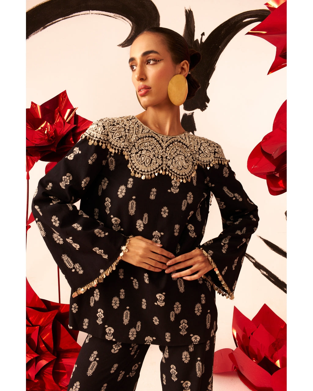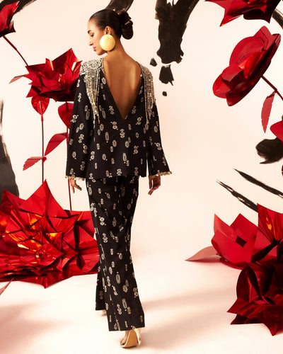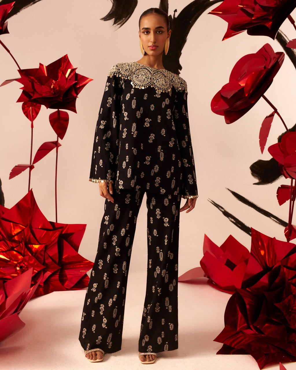 Rely on timeless elegance with this Black floret tunic and pant set. Made with premium materials, it features a floret print embroidered tunic with tassel detailing and matching pants. Perfect for formal or everyday events.