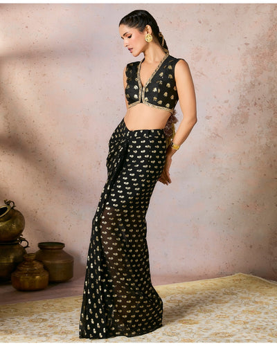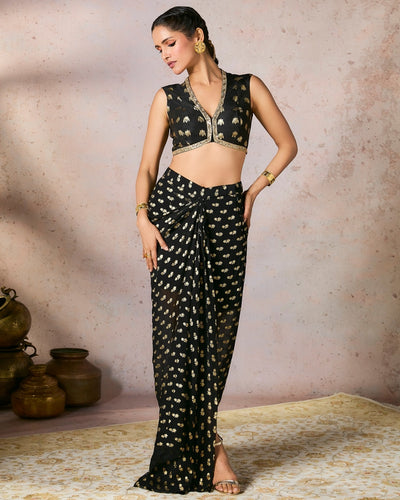 Elevate your style with our black palmscape skirt set. The foil printed blouse with embroidered borders and 'V' neckline exudes elegance. The drape skirt features a stunning all over print, side slit detail, and side seam closure. Perfect for a sophisticated look.