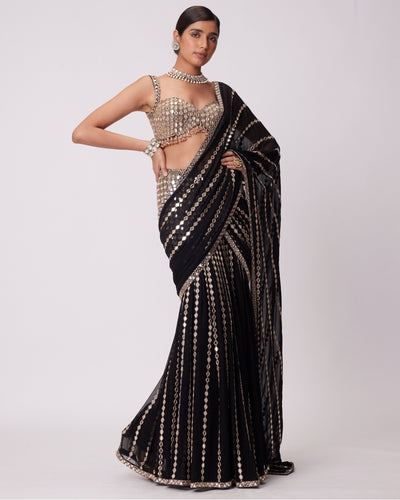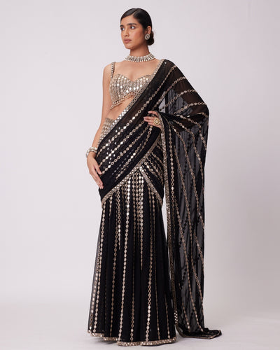 Expertly crafted from delicate Black georgette, this pre draped hand embroidered sari is a must-have for any fashion-forward individual. The real hand cut mirror embroidery adds a touch of artistry to the sleek silhouette. Complete with a sleeveless blouse, this sari set is perfect for formal occasions.