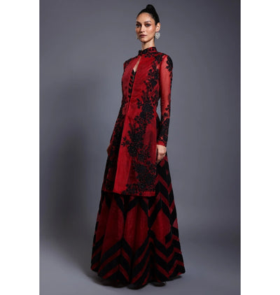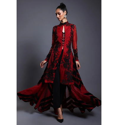 This CF chevron maroon anarkali features a luxurious maroon organza jacket with intricate black thread work and sparkling crystal embroidery. Paired with a maroon velvet tape chevron anarkali and sleek cigarette pants, this ensemble exudes elegance and sophistication. Elevate any occasion with this stunning outfit.