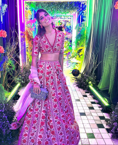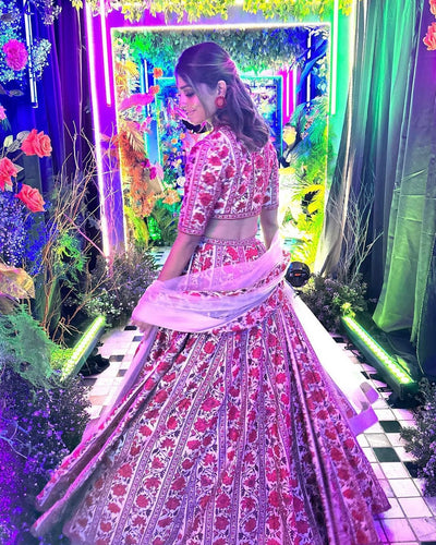 The Charmaine lehenga features a red beige full printed raw silk embroidered blouse with a matching printed lehenga. Complete with a tulle dupatta with four side printed borders.