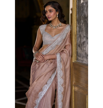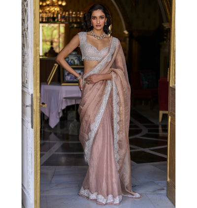 Indulge in luxury with our Copper tissue organza sari. Adorned with intricate embroidery of pearls, sequins, bugle beads, and crystals, this exquisite saree exudes elegance. The fully embroidered cap sleeve blouse boasts tassels at the sleeve hem, waist, and back for added flair. Finished with a delicate organza frill, this saree is a true work of art.