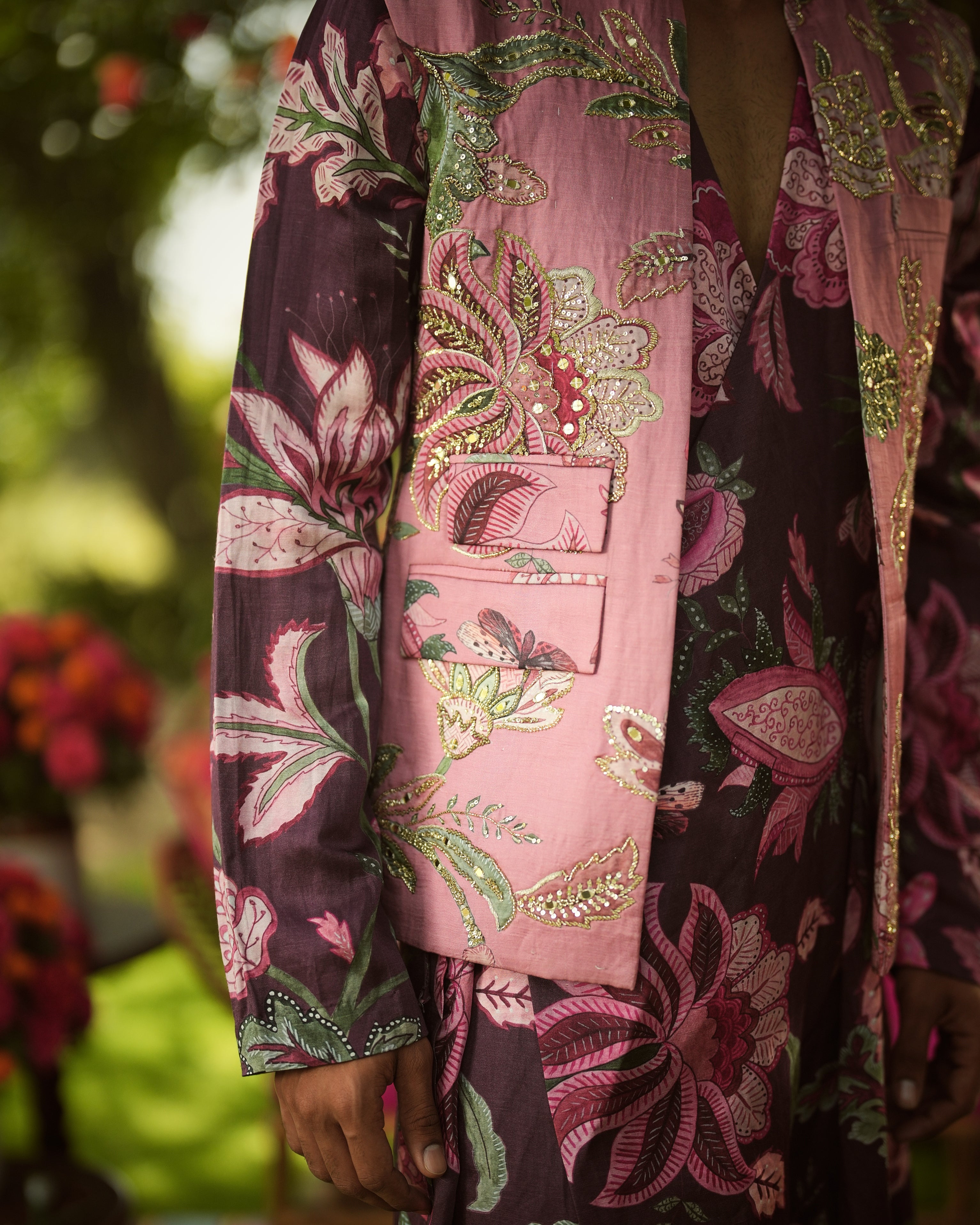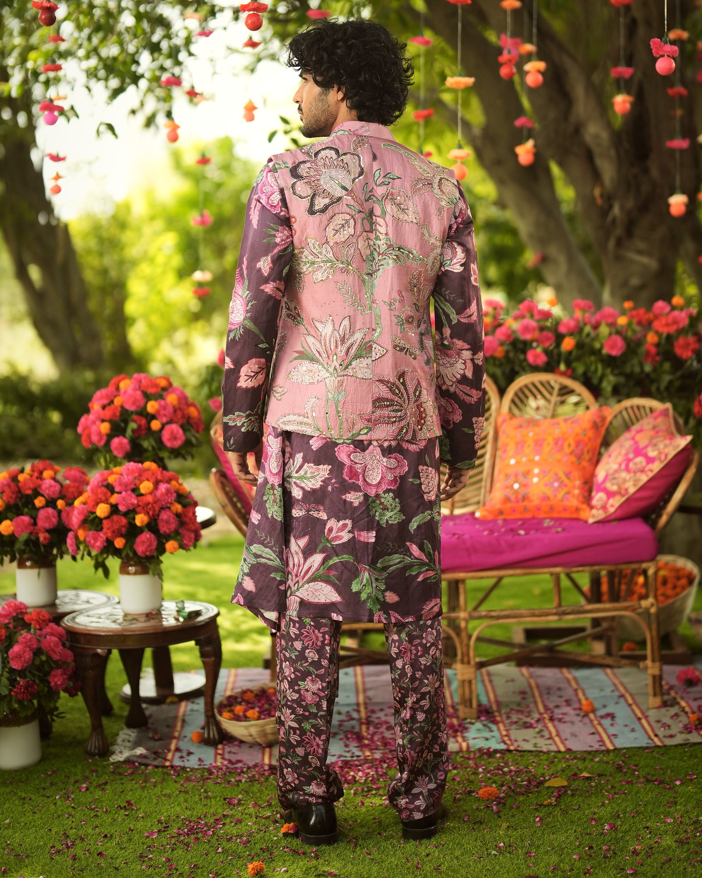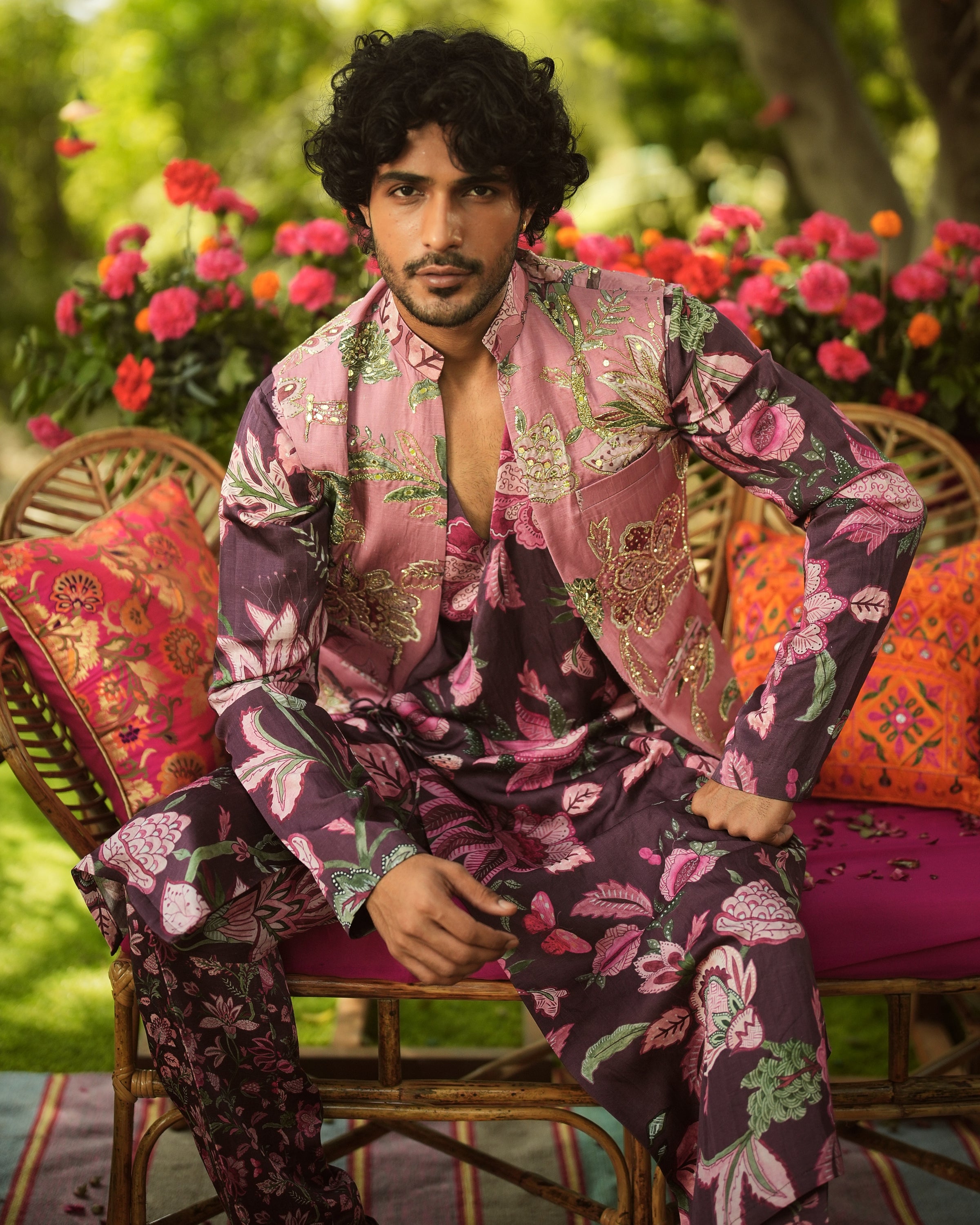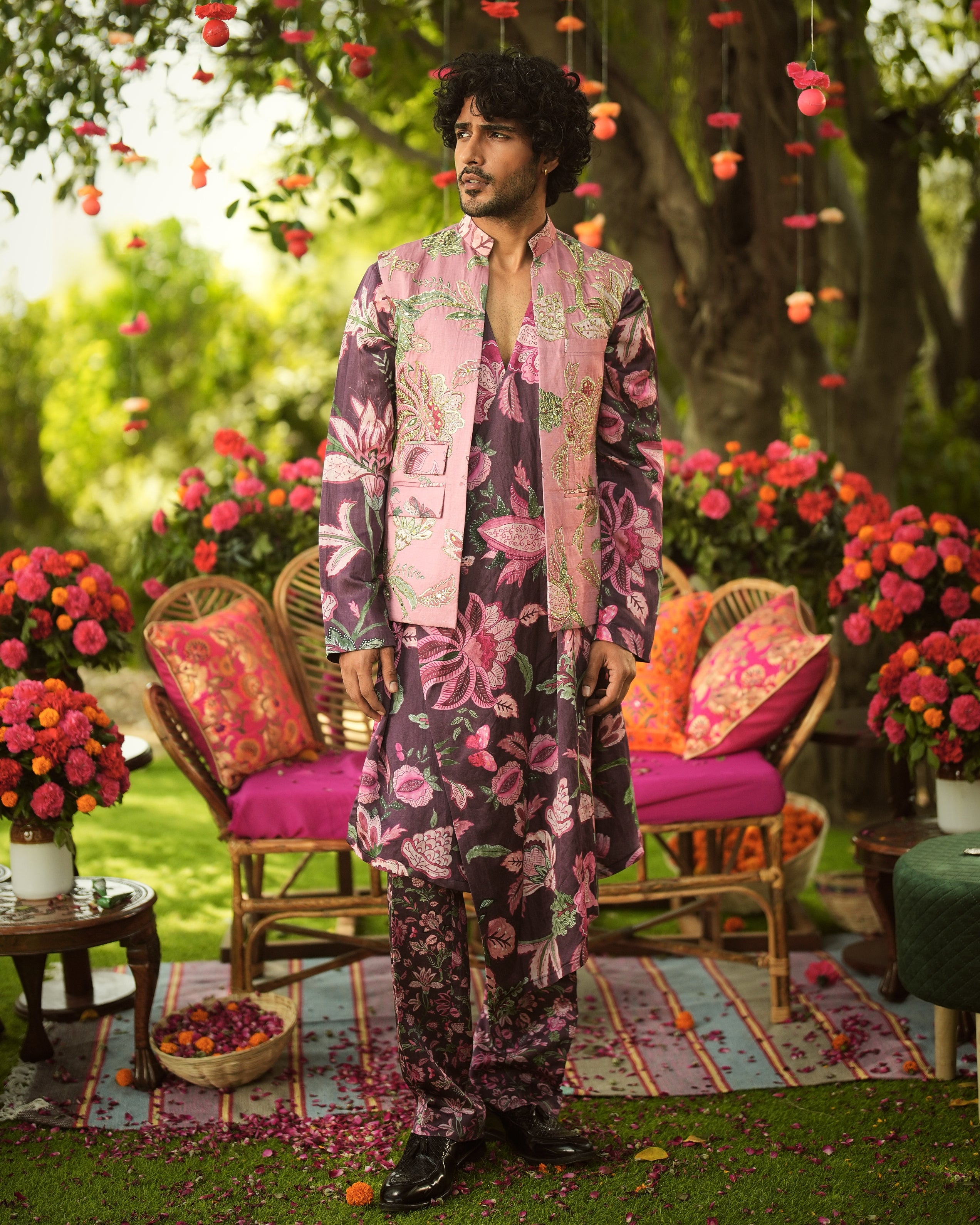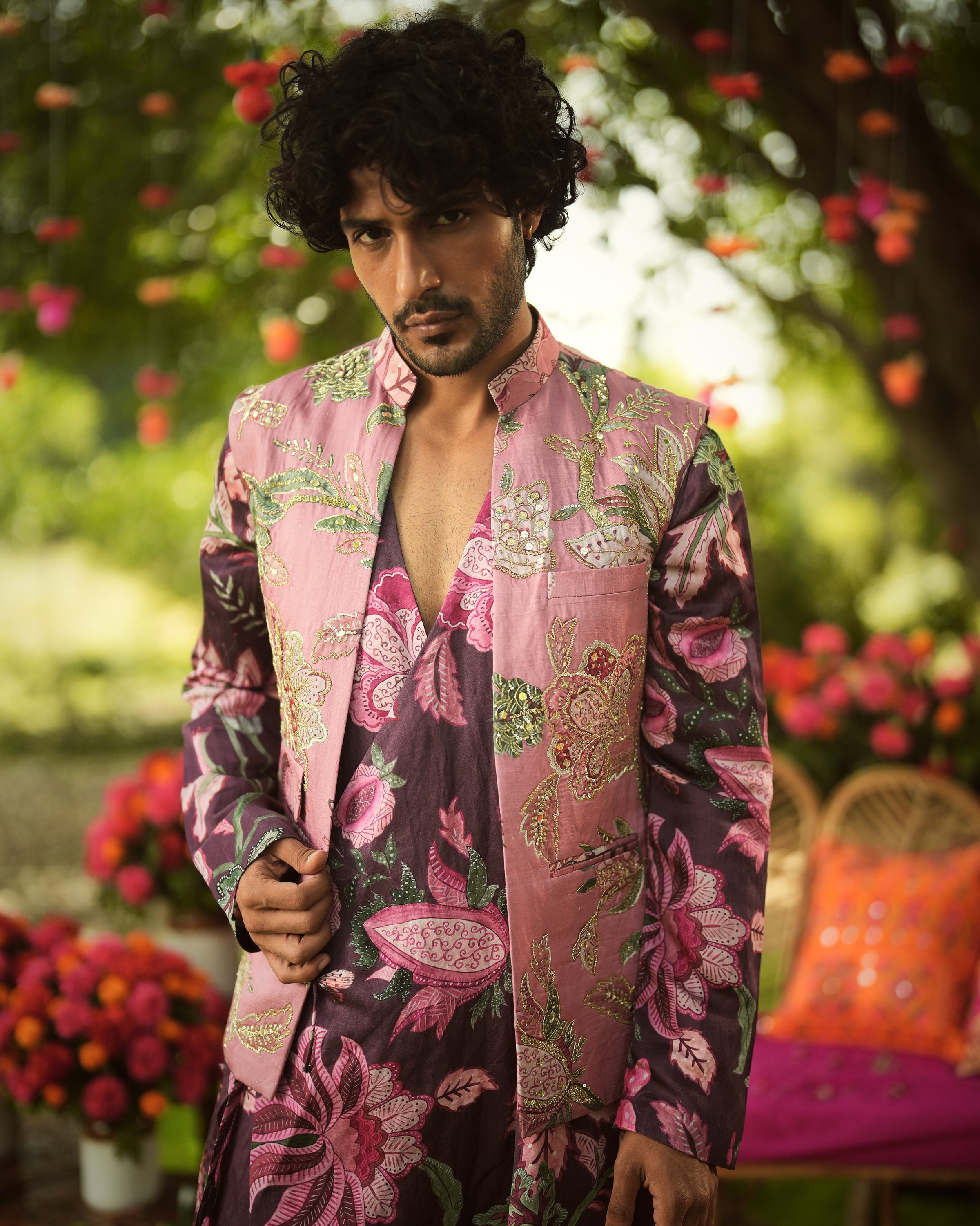 Elevate your formal attire with the Faraz nehru jacket set, featuring a meticulously hand-embroidered bandi paired with an elegant angrakha kurta. This sophisticated ensemble seamlessly blends traditional craftsmanship with contemporary styling, creating a distinguished look perfect for special occasions and cultural celebrations.