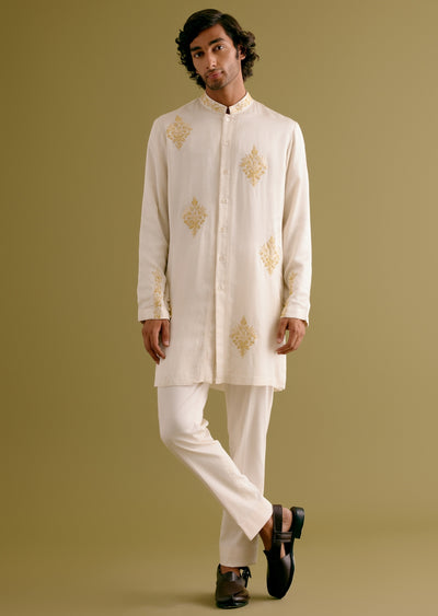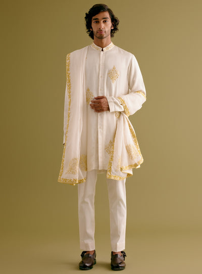 Indulge in luxury with our Ivory front-open dori embroidered kurta set. Made from silk satin fabric, this front-open kurta boasts stunning dori embroidery for a touch of elegance. Accompanied by matching ivory pants, this set offers both comfort and style. Elevate your wardrobe and make a statement with this exquisite set.