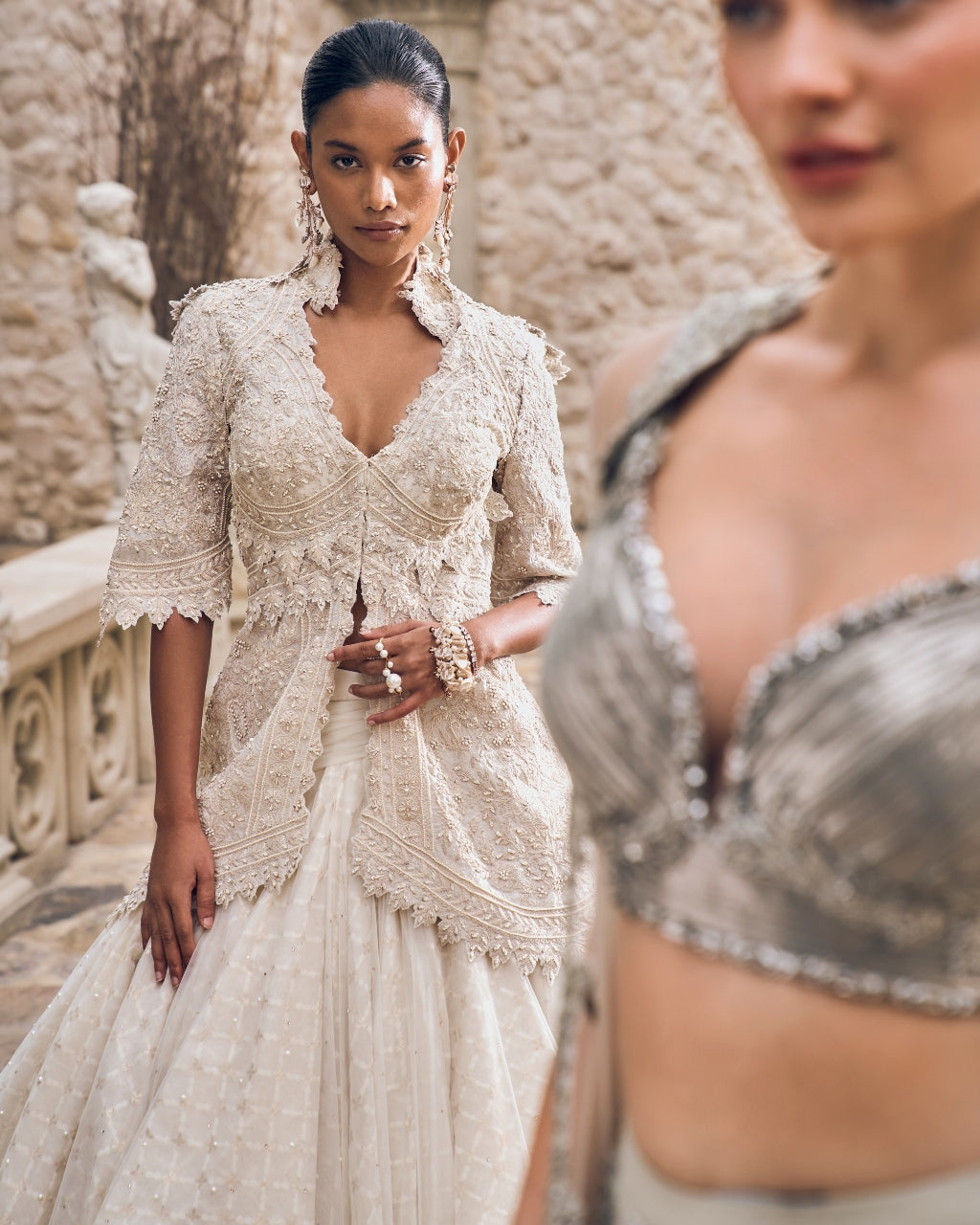 Enhance your engagement look with our Ivory neo drape lehenga set. The high quality imported net fabric and intricate dori and zardozi embroidery on the jacket add a touch of luxury. Perfect for your special day.