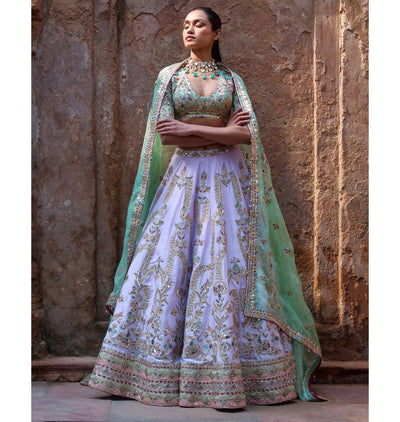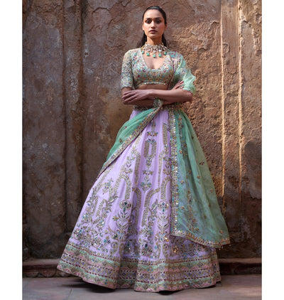 Elevate your style with our Lilac chanderi lehenga set. This exquisite ensemble features a lilac chanderi lehenga paired with a sage green blouse and a stunning organza dupatta. The intricate resham, gota, foil, and mirror embroidery, along with the beaded embellished neckline, adds a touch of luxury to this ensemble. Make a statement with our exclusive design.