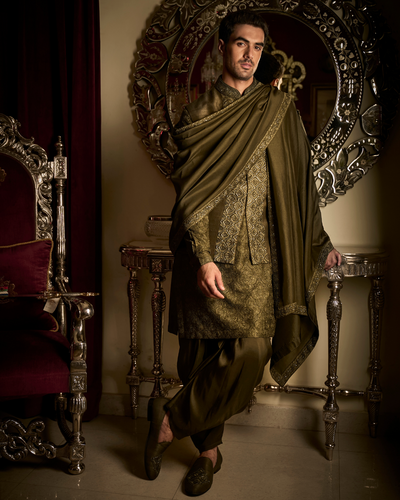 This military green Bandi set is perfect for those special occasions. Expertly crafted with threadwork, french knots, and sequin embroidery, the Bandi is paired with a fully embroidered kurta and matching silk dhoti salwar.