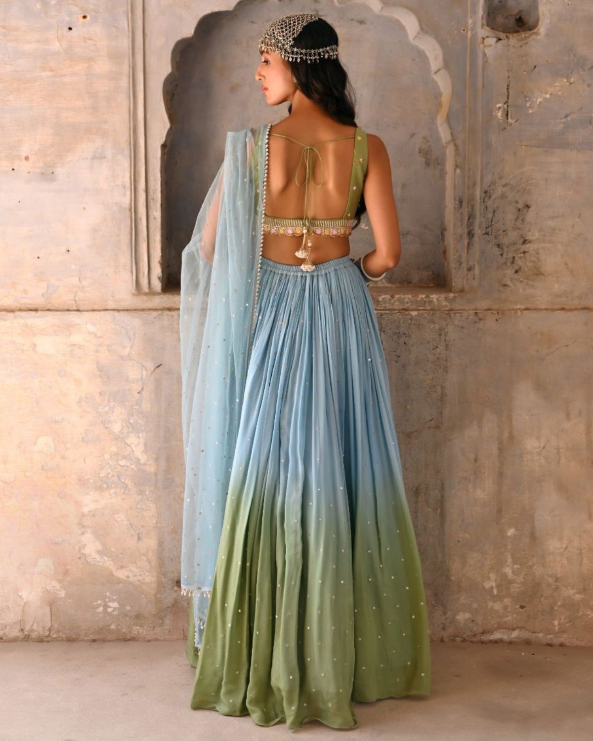 The Monet Ombré Lehenga set features an intricately embroidered blouse adorned with resham zardozi and glass beads. The shaded georgette skirt and the tulle dupatta make for an alluring ensemble, perfect for any special occasion.