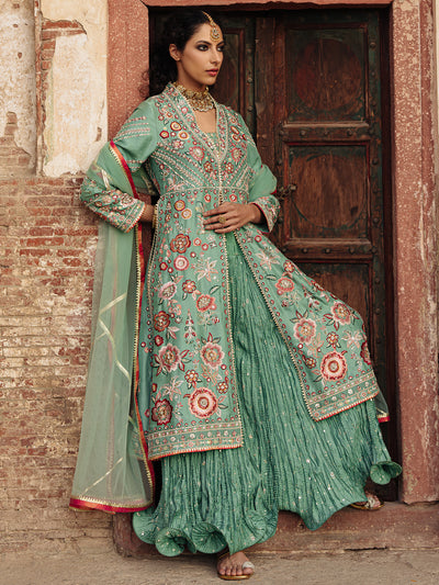 The nayab kurta exudes effortless glamour for the modern woman. Crafted from dusty turquoise raw silk, it features multi-hued resham embroidery highlighted with zardozi accents in complementing hues, showcasing chintz florals motifs and is paired with crushed sharara and embellished net dupatta.